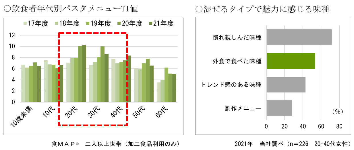 外食で食べた経験のある味種は、味の想起がしやすく、また食卓に新鮮さを取り入れることができるため、「混ぜるタイプ」のパスタソースにおいて需要が高まっています。