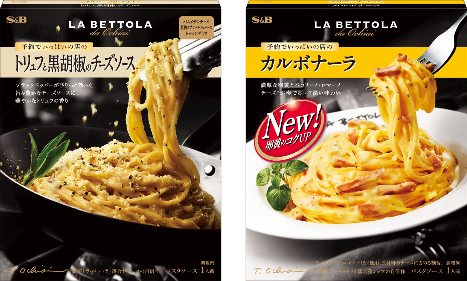エスビー食品株式会社は、東京・銀座「ラ・ベットラ」のオーナーシェフ落合務氏が監修する、本格的な味わいが人気のパスタソース「予約でいっぱいの店」シリーズから、旨み豊かなチーズソースにトリュフが華やかに香る「トリュフと黒胡椒のチーズソース」を新発売、また「カルボナーラ」をリフレッシュします。