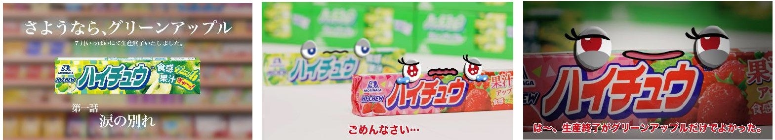 本動画では、「ハイチュウ」たちが喋り出し、全3話を通して各フレーバーがグリーンアップル味に別れを告げます。定番のストロベリー味やグレープ味に加えて、新登場のうまイチュウ青りんご味が登場。別れを惜しみながらも、「生産終了がグリーンアップルだけでよかった」と口を滑らすストロベリー味や、食感と味わいの違いで先輩を煽りまくるうまイチュウ青りんご味など、悲しい動画タイトルとは裏腹にハイチュウたちの本性が垣間見えるコミカルな動画となっています。