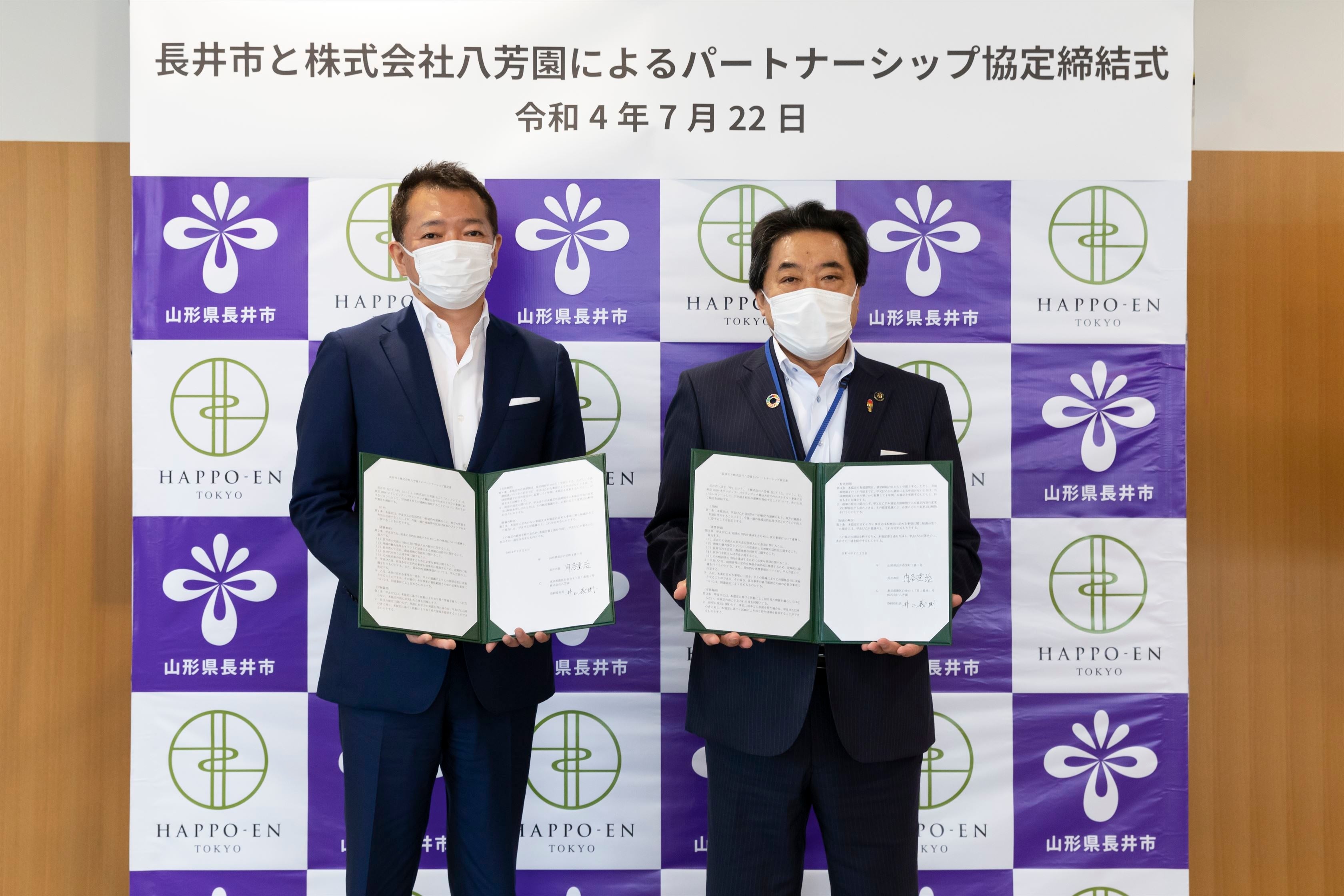 総合プロデュース企業 株式会社八芳園(取締役社長:井上義則、東京都港区白金台1‐1‐1、以下「八芳園」)は、山形県長井市との「パートナーシップ協定」において、2022年7月22日(金)に締結式を執り行いました。東京2020大会でのホストタウン事業におけるレガシーとして、引き続き相互の連携を強化し、双方の資源を有効活用したより一層の地域活性化および双方のブランド向上を目指してまいります。