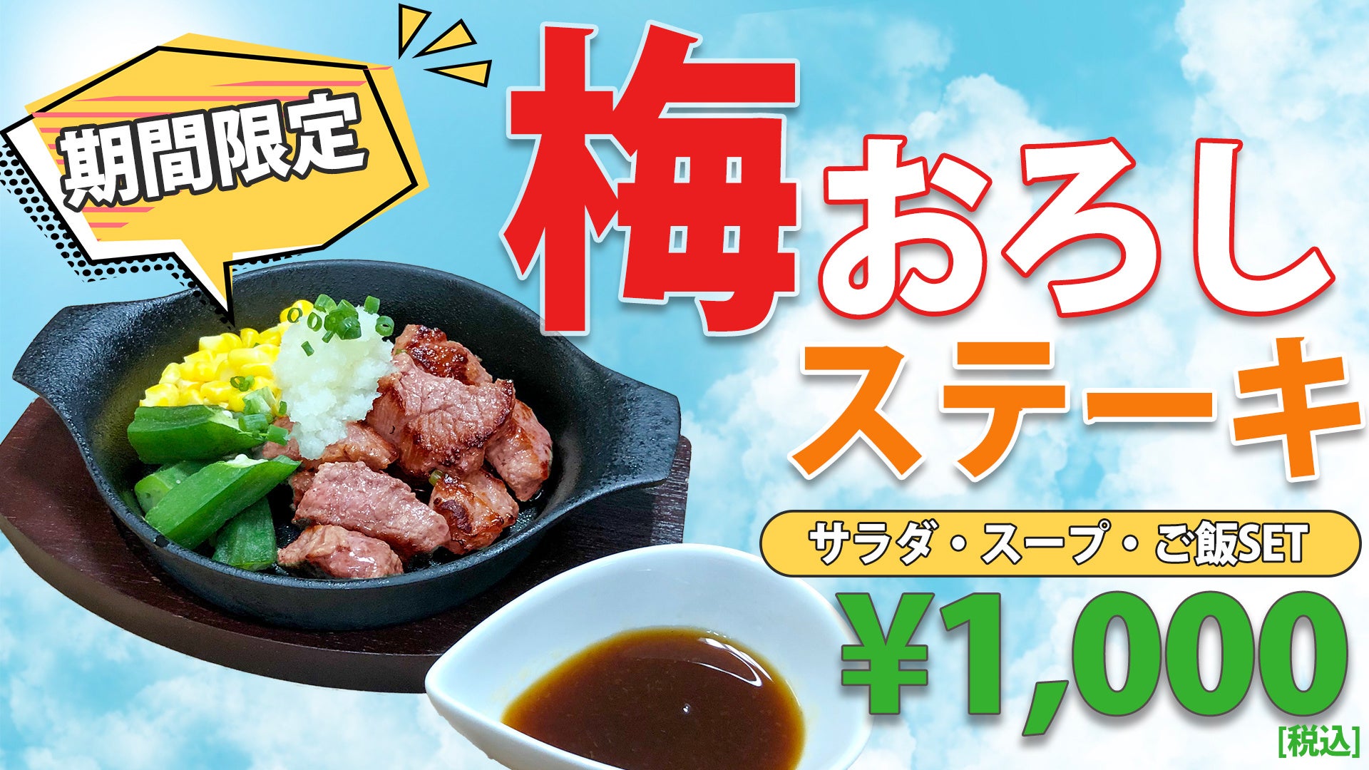 やっぱりステーキ待望の新メニューです スタミナ補給・塩分補給にも!「梅おろしステーキ」ぜひお試しください! ※もっと食べたい方には替え肉の追加注文もできます!