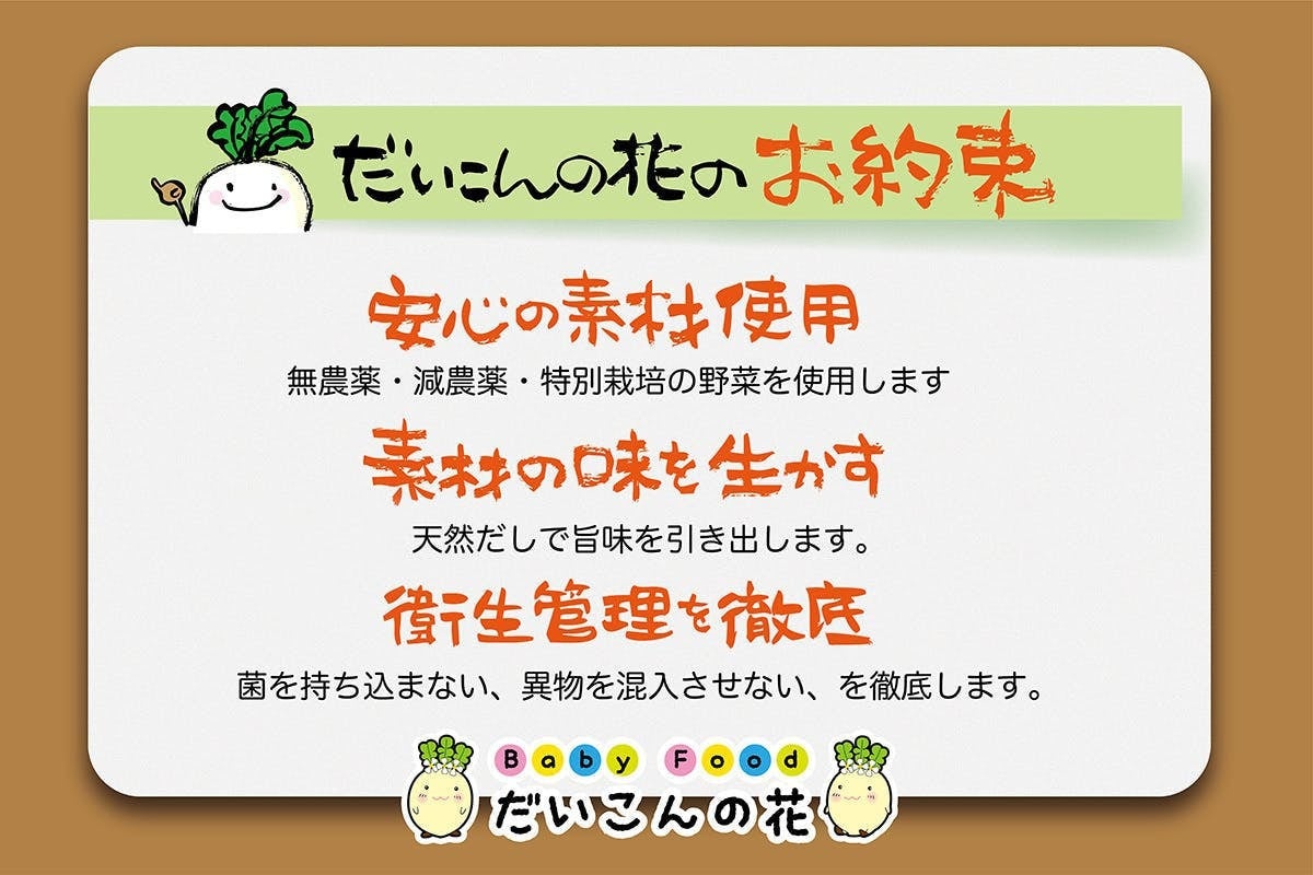 だいこんの花のレストランは、私たち野菜ソムリエにとっても憩いと語らいの場でした。親族の家のような温かさと、食べる人の健康に配慮した自然な料理が大好きでした。赤ちゃん連れのご家族に、手をかけたこだわりの離乳食のサービスをしている姿を見た時はなんて優しい店なんだろうと感激し、心がさらに温かくなったものです。赤ちゃんのうちから安心できる食べ物を与えたいと思っても、育児や家事、家族のことで忙しく、自分のことはつい後回しになってしまいますよね。そんな時は、便利な離乳食を活用してゆとりと笑顔の時間を作りましょう。ママの笑顔は赤ちゃんの健やかな成長にも繋がることでしょう。栄養のあるものを安全に提供したいという企業のやさしさがたくさん詰まっただいこんの花の離乳食。こだわりの離乳食の復活が嬉しいです。私も応援しています。