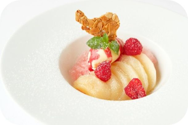 【“ピーチ・メルバ”ブラッスリー ポール・ボキューズ 銀座スタイル福島県産白桃のコンポート バニラアイスクリームとラズベリー】