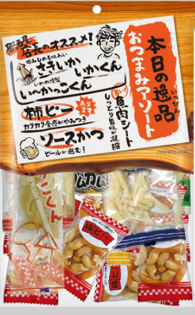 バラエティに富んだ6種の人気おつまみ(柿ピー、い~かっこくん、さきいか、ソースかつ、いかくん、魚肉シート)をセットにした商品です。
