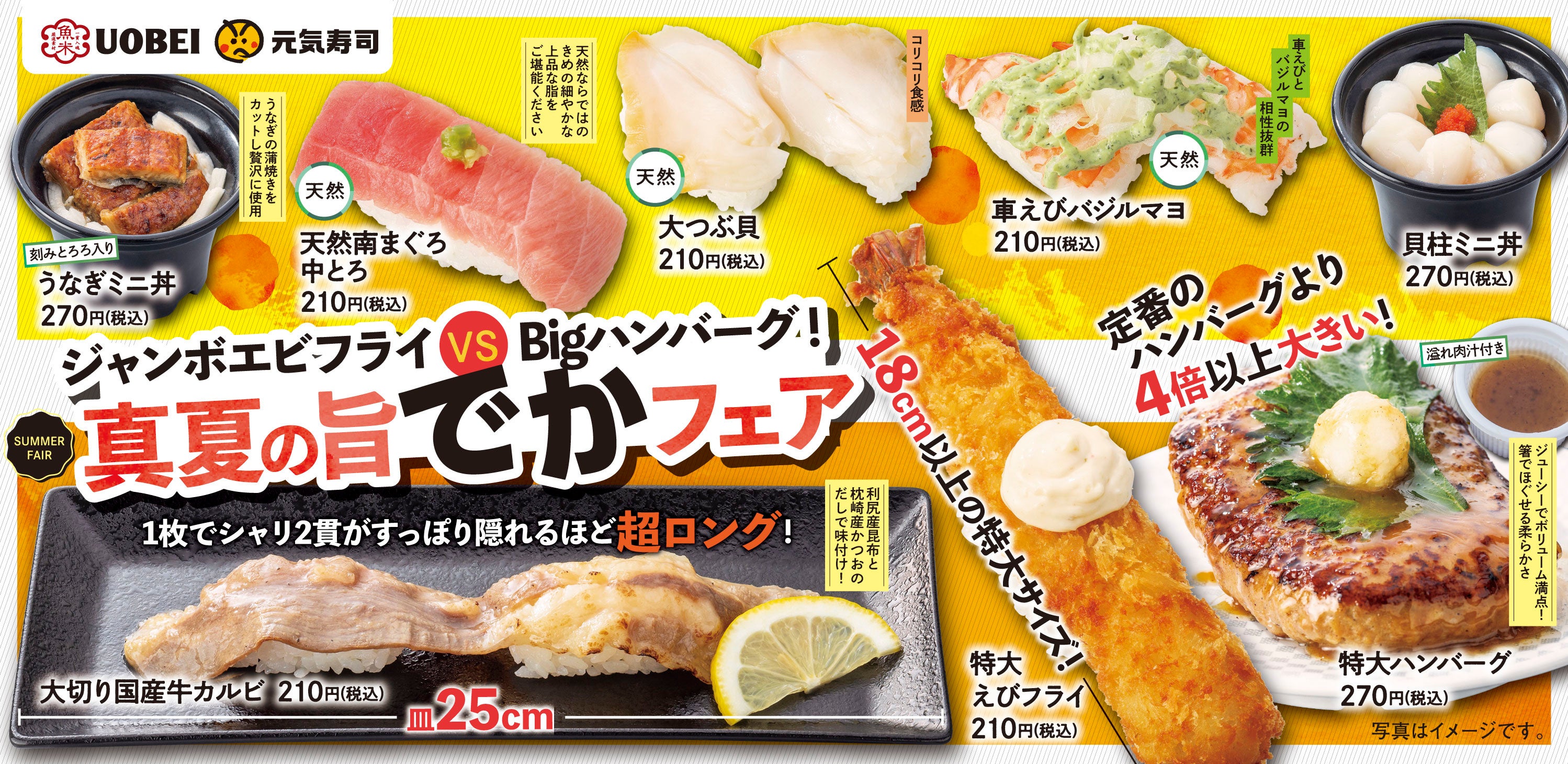寿司レストランチェーンを展開する元気寿司株式会社(本社:栃木県宇都宮市 代表取締役社長 法師人尚史)は、2022年8月5日(金)より全国の魚べい、元気寿司にて「ジャンボエビフライ VS Bigハンバーグ!真夏の旨でかフェア」を開催します。18cm以上の「特大エビフライ」、定番ハンバーグより4倍以上大きな「Bigハンバーグ」をはじめとする、計8品を期間限定で販売いたします。