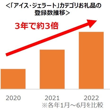 「さとふる」では全国のご当地アイスクリームを掲載しています。「アイス・ジェラート」カテゴリのお礼品の登録数は1月~6月の期間で比較すると、2020年からの3年間で約3倍に増加していることが分かりました。地場のミルクや特産品のフルーツを加工したアイスクリームなど、地域色が楽しめるラインアップになっています。「アイス・ジェラート」カテゴリお礼品の2022年1月~6月の寄付金額は2020年同期比で、約1.7倍に伸長しており、ふるさと納税を通じ、冷たいスイーツを楽しんでいる方が増加していることが分かります。また、昨年6月との同月比較では「ギフト」と入った「アイス・ジェラート」カテゴリお礼品の寄付金額は約3倍伸長しており、夏用ギフトとしての需要が高まっていることが推測されます。