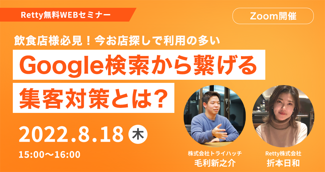 実名口コミグルメサービス「Retty」を運営するRetty株式会社(本社:東京都港区、代表取締役:武田 和也、以下Retty)は、飲食店向けWebセミナー「飲食店様必見!Google検索から繋げる飲食店集客とは?」を8月18日(木)15:00〜16:00に開催します。Rettyは飲食店のみなさまがよりよい集客を実現しHappyな食体験を生み続けられるよう、サポートしてまいります。