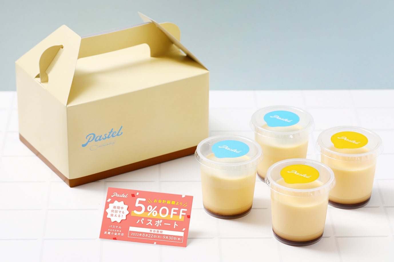 ・内容:パステル看板商品の「なめらかプリン」を2個、「パステルのカスタードプリン」を2個、期間中何回でもご利用いただける「5%OFFパスポート」1枚をセットにした5日間限定セットです。