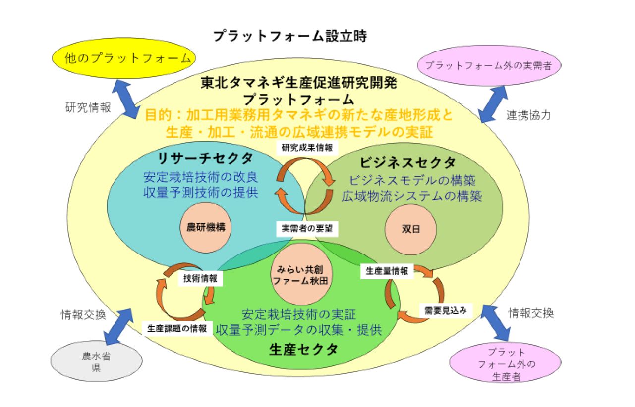 東北タマネギ生産促進研究開発プラットフォームは、多様な分野の会員が集まって交流することによって新たなイノベーションを創出する目的で農林水産省が運営している、『「知」の集積と活用の場®』の中で設立します。タマネギスマート安定生産技術を軸として、生産・加工・流通システムのモデルケースの構築を行い、東北地域での産地形成と連携を推進していくことを目的としています。本研究開発プラットフォームの場を活用して、生産から加工、流通、消費に係る個人・法人の連携を促進し、国産野菜の供給力強化に取り組んでまいります。