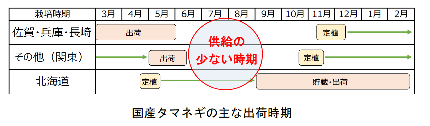 国産タマネギは、主産地である北海道、佐賀県、兵庫県で約8割が生産されており、西日本産から北海道産に切り替わる6〜8月の期間に国産の供給量が減ります。そのため、この時期には国内消費量の約6割を占める加工・業務用向けタマネギで輸入品の使用が増えますが、国産タマネギの需要は強く供給拡大が求められています。また、主産地が限られていることは、一産地の不作が供給量や価格に直結し、関係業界や国民生活に大きな影響を与えることとなります。