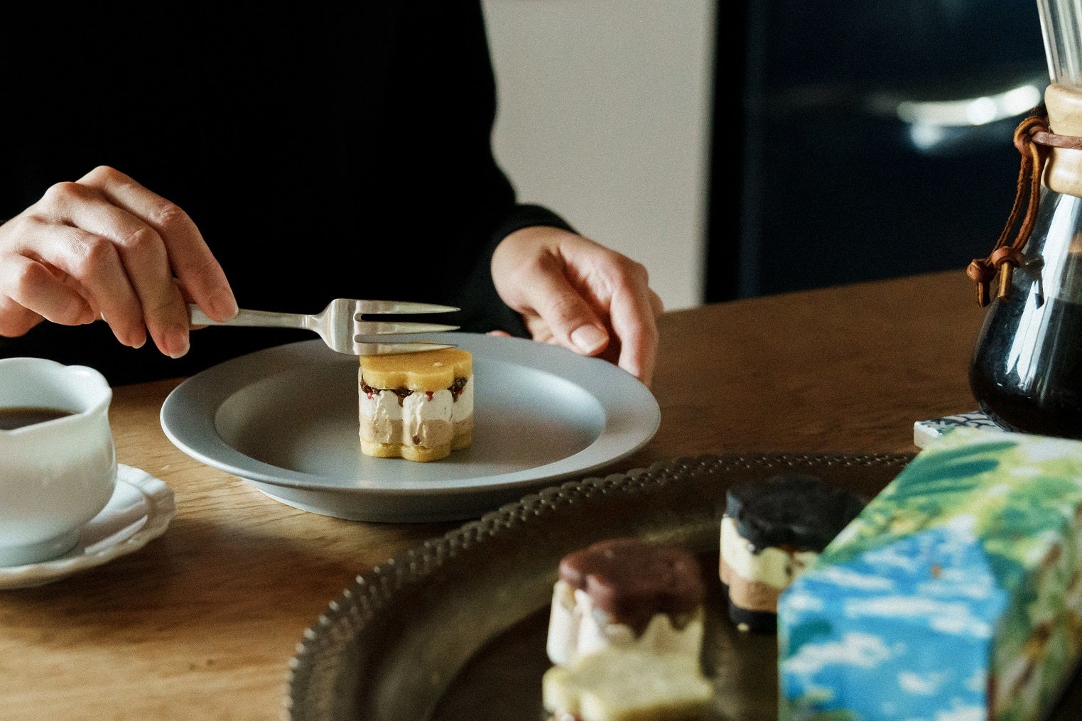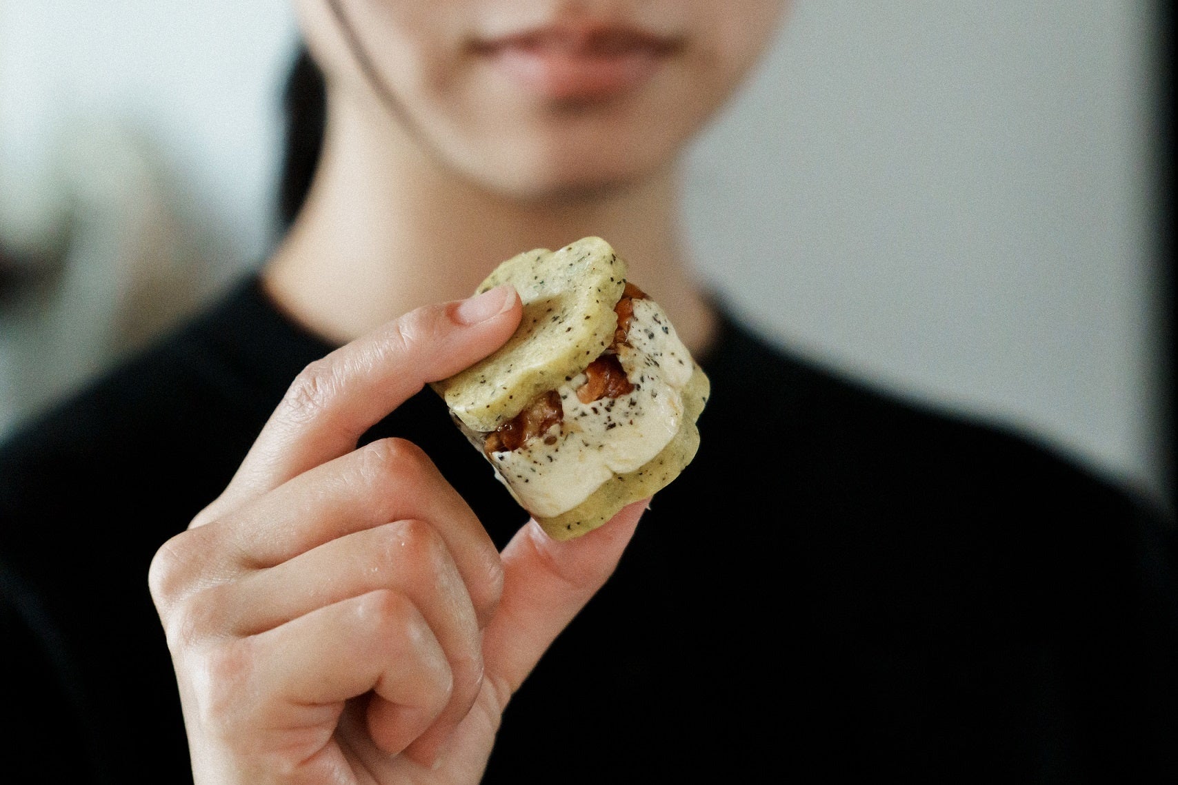 バターとチーズ。果物、木の実にチョコレート。さまざまな素材を重ね合わせた完成形は絵画のように。冷たいのも、なめらかなのもそれぞれ良く、舌の上にさまざま映り込む、色や香り。誰かを思い出したり、旅に出かけてみたくなったり。漂う雲のように、軽く甘い。季節や景色の広がりを感じていただきたいバターサンドです。