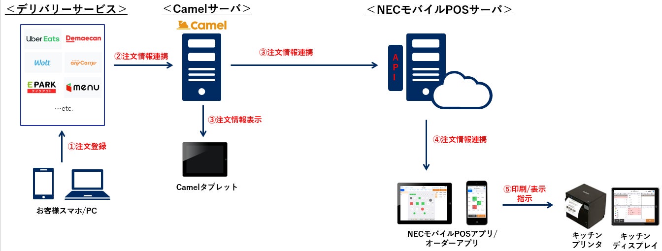 日本電気株式会社(本社:東京都港区、代表取締役執行役員社長 兼 CEO 森田 隆之、以下NEC)は2022年7月20日(水)、サブスク型POS「NECモバイルPOS」の最新バージョン(Ver2.44.0)において、tacoms社のデリバリー注文一元管理サービス「Camel(キャメル)」との連携機能をリリースしました。