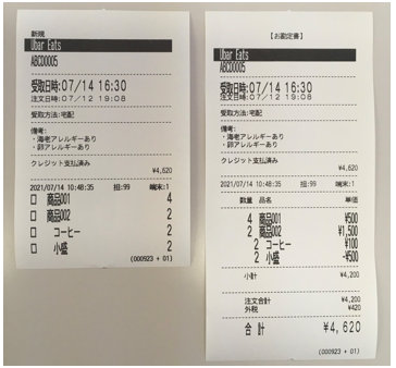 今回の連携では、各デリバリーサービスから受け付けた注文データを、モバイルPOSのキッチンプリンタ、キッチンディスプレイに印字することができるようになりました。これにより、デリバリー注文情報をPOSに再入力するという手間を削減できます。