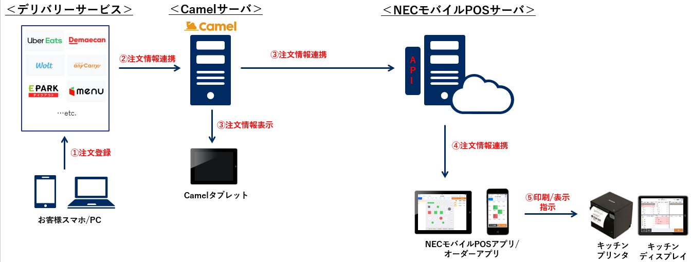 日本電気株式会社(本社:東京都港区、代表取締役執行役員社長 兼 CEO 森田 隆之、以下NEC)は2022年7月20日(水)、サブスク型POS「NECモバイルPOS」の最新バージョン(Ver2.44.0)において、tacoms社のデリバリー注文一元管理サービス「Camel(キャメル)」との連携機能をリリースしました。