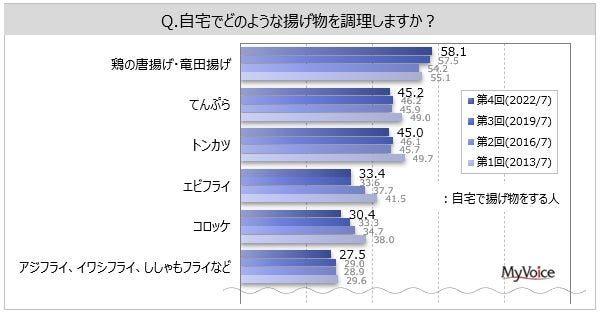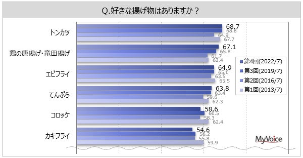 | <今 回>(2022/7)https://myel.myvoice.jp/products/detail.php?product_id=28806 ※上記設問の他に、「揚げ物の嗜好度」「調理済みの揚げ物の購入場所」も聞いています。 <第3回>(2019/7)https://myel.myvoice.jp/products/detail.php?product_id=25204 |