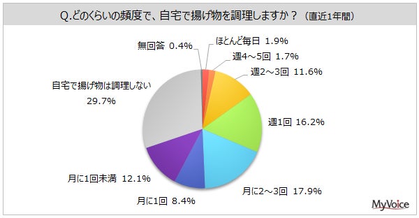 直近1年間に自宅で揚げ物をする人は7割です。頻度は「週1回」「月に2~3回」がボリュームゾーン、週1回以上は3割強となっています。