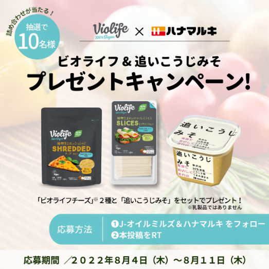 また、Twitterキャンペーンの期間は、8月4日(木)~8月11日(木)まで。期間中、両社のTwitter公式アカウントをフォロー&リツイートした方の中から抽選で10名様に、『ハナマルキ:無添加減塩 追いこうじみそ 650g』、『ビオライフ:植物生まれのとろけるスライス モッツアレラタイプ 140g』、『ビオライフ:植物生まれのシュレッド チェダータイプ 200g』の3点セットをプレゼントします。