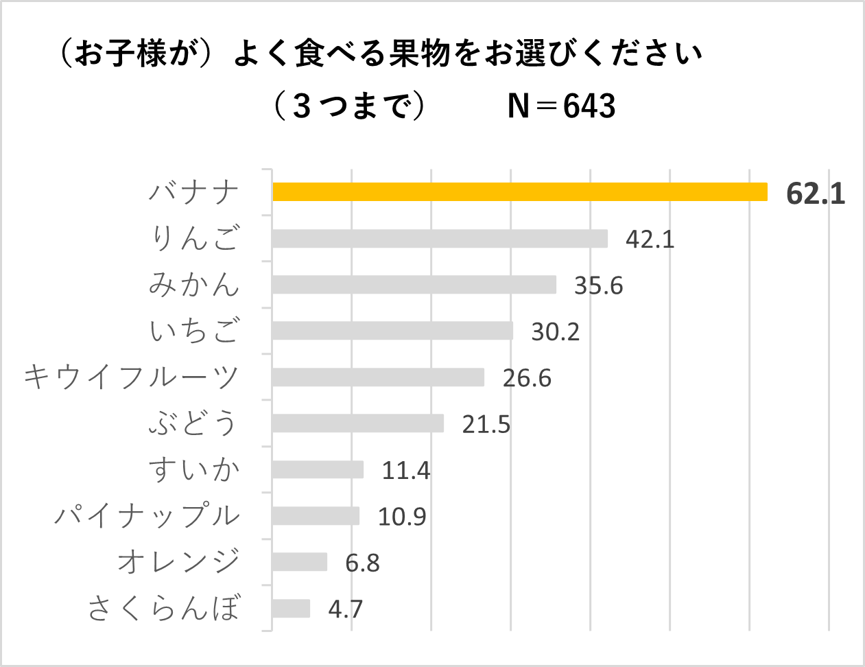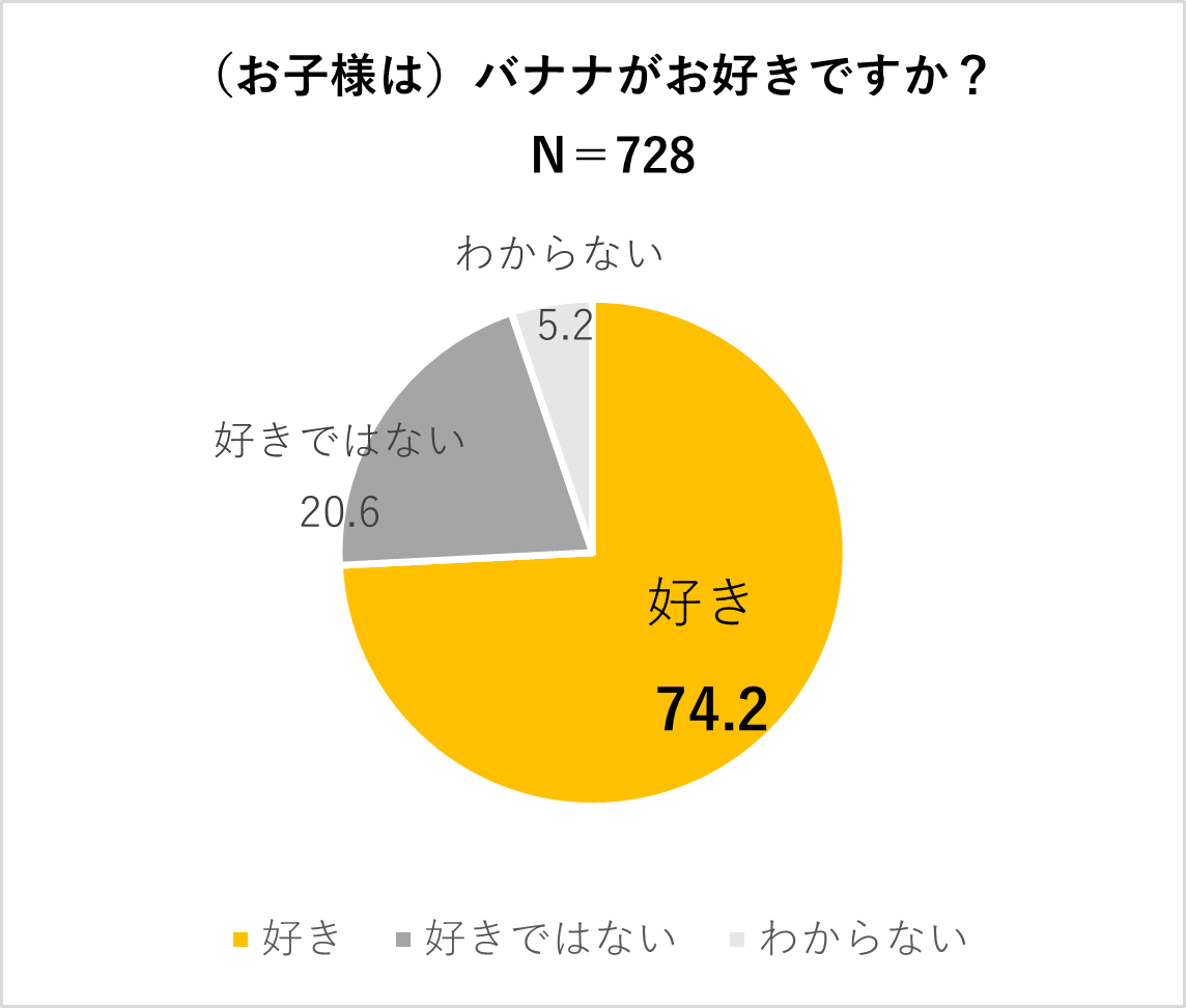 また、子ども調査でも同様の質問をしたところ、62.1%の子どもがよく食べる果物として「バナナ」と回答し、昨年に引き続き、バナナは子どもから大人まで幅広い世代に支持されているということを示しました。さらに「(お子様は)バナナが好きか?」という質問に対しては7割以上となる74.2%の子どもが「バナナが好き」と回答し、子どもからのバナナ人気も昨年同様の結果となりました。