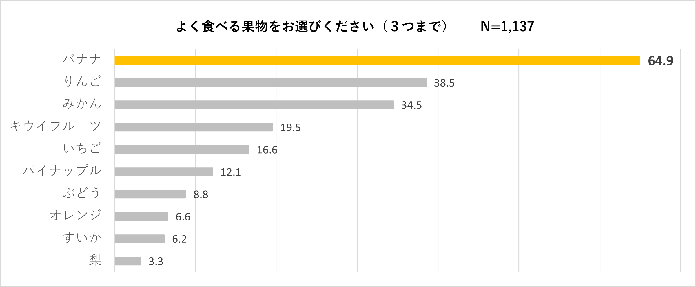 「あなたがよく食べる果物は?」という質問に対し大人調査では、64.9%の人が「バナナ」と回答し、続くりんご(38.5%)やみかん(34.5%)と大きく差をつけて第1位となりました。2005年より実施してきた調査結果も踏まえて、バナナは18年間変わらずよく食べられている果物であるということが、今回の調査で明らかになりました。