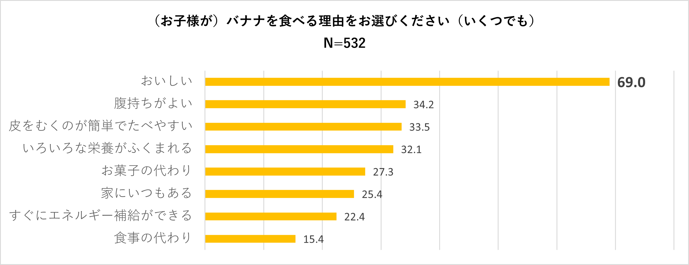 一方、子ども調査では約7割の69.0%の子どもが「おいしいからバナナを食べる」と回答し、大人と比べて「おいしい」の割合が、17%近く高くなっています。他に「いろいろな栄養がふくまれる」(32.1%)は大人同様に上位になるとともに、「腹持ちがよい」「皮をむくのが簡単でたべやすい」なども高い割合となり、子どもにとってバナナはおいしさとともに手軽な補食としての役割も大きいということが分かりました。