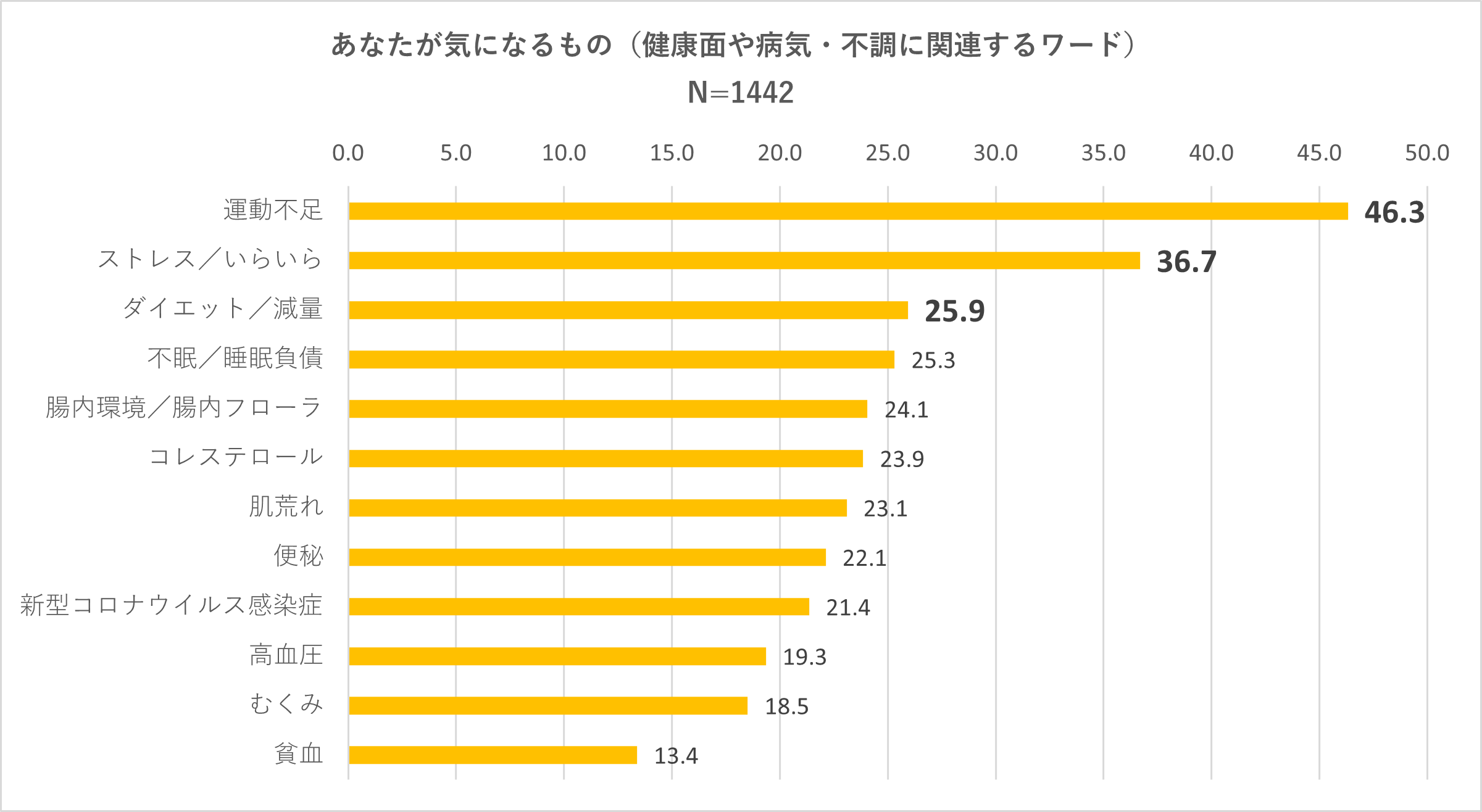 健康面や病気・不調に関連し、気になる項目では、「運動不足」46.3%、「ストレス/いらいら」36.7%、「ダイエット/減量」25.9%が上位に挙がり、2020年初めから2年以上にわたって続く新型コロナウイルス感染症の影響が伺えます。