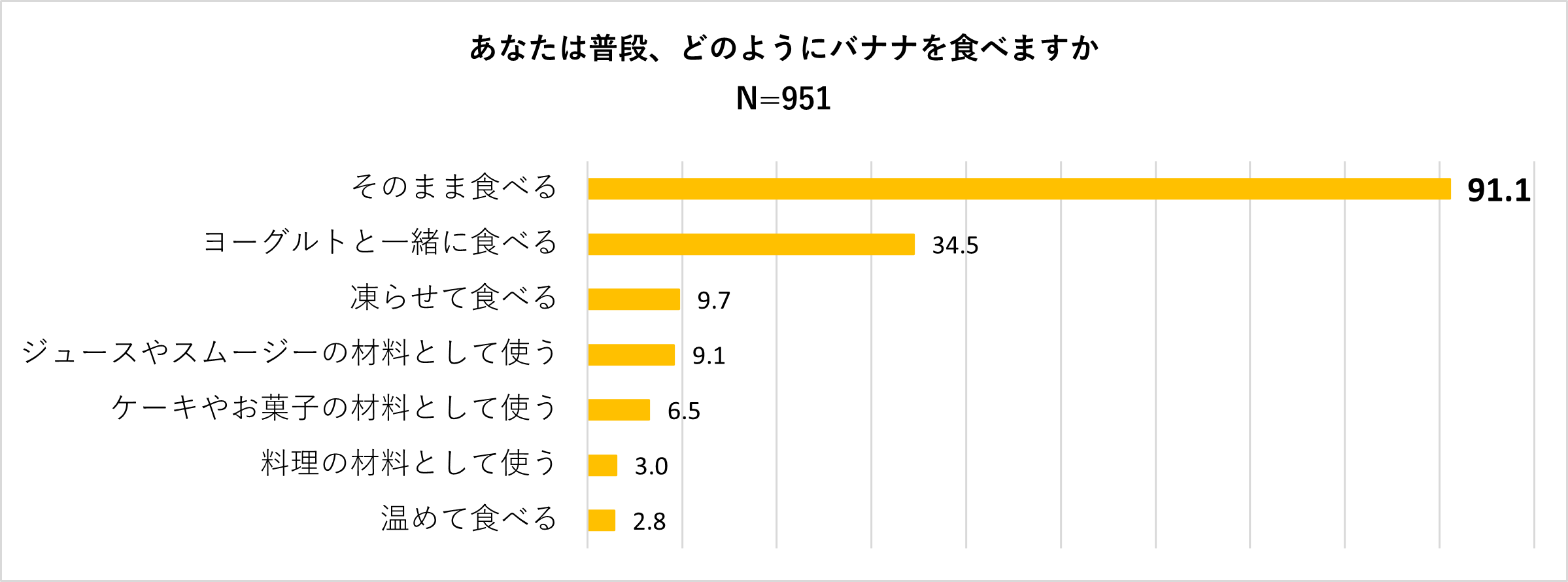 ◆ 「そのまま食べる」以外でのバナナの食べ方として多いのは、「ヨーグルトと一緒に」「凍らせて」、「ジュースやスムージーの材料として」