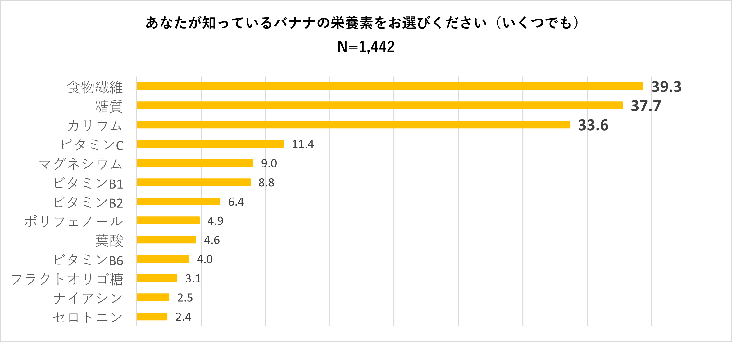 知っているバナナの栄養素は「食物繊維」「糖質」「カリウム」がTOP3に。4位以下には、マグネシウムや、夏に効果的な「ビタミン」B群や「セロトニン」といった栄養素も。