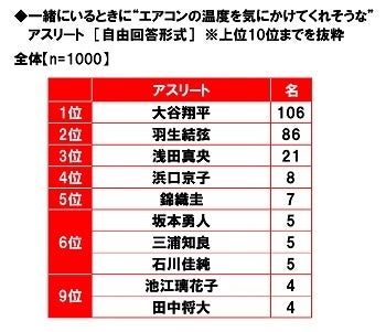一緒にいるときに“エアコンの温度を気にかけてくれそうな”アスリートを聞いたところ、プレー以外の場面での紳士的なふるまいが度々話題になる「大谷翔平さん」がダントツでした。続いて、2位「羽生結弦さん」、3位「浅田真央さん」となりました。