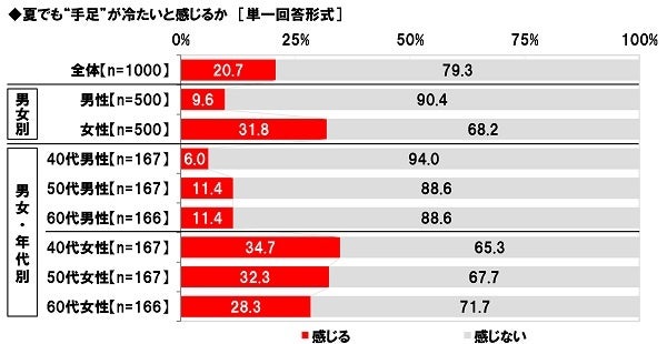 - 「夏でも手足が冷たいと感じる」男性では10%、女性では32%