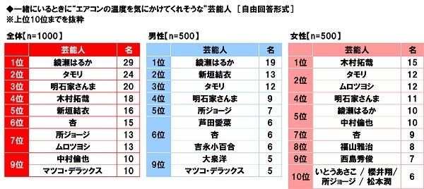 - 一緒にいるときにエアコンの温度を気にかけてくれそうな有名人 芸能人部門1位「綾瀬はるかさん」2位「タモリさん」、女性回答1位は「木村拓哉さん」 アスリート部門1位「大谷翔平さん」2位「羽生結弦さん」
