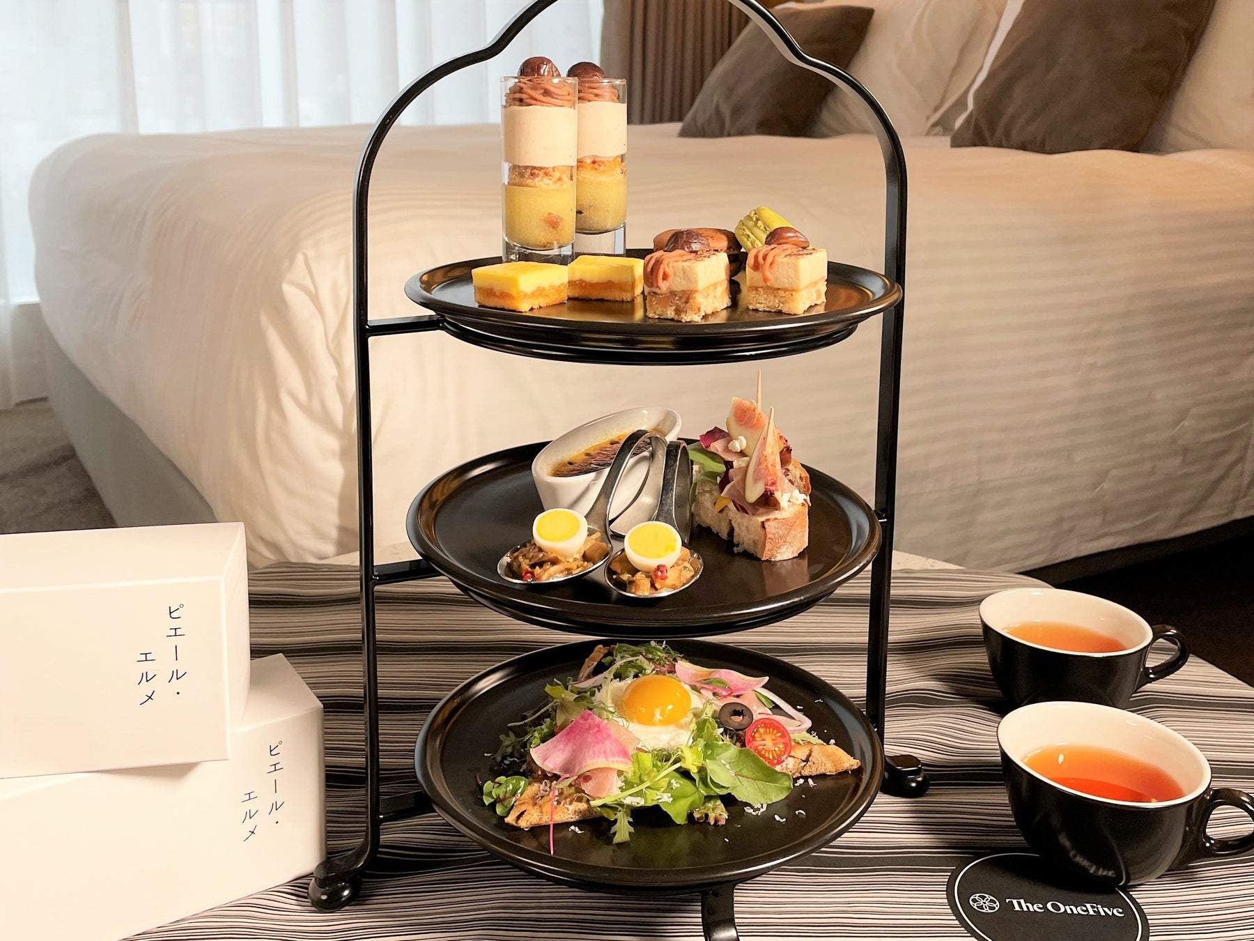1段目は定番人気のマカロンや柚子を使用したチーズケーキなど、ピエール・エルメの秋を一皿に。2段目はフレッシュなイチジクや、旬の茄子をアレンジしたフレンチ仕立てのセイボリー。3段目はフランスの定番おやつ、ガレットにThe OneFive流の遊び心を加えました。