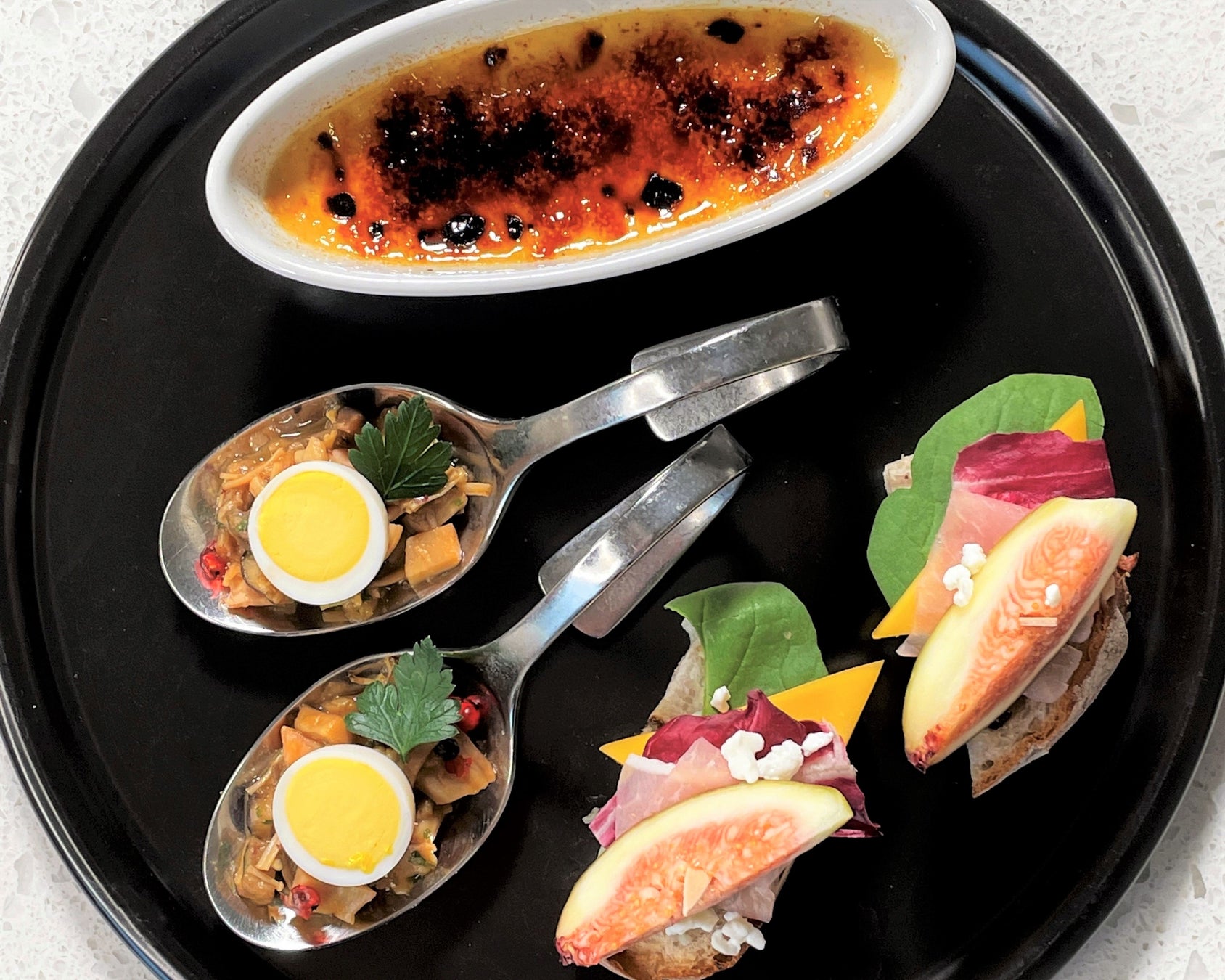 ロワイヤル(洋風茶碗蒸し)と焼き茄子を合わせてキャラメリゼし、ほろ苦く仕上げています。
