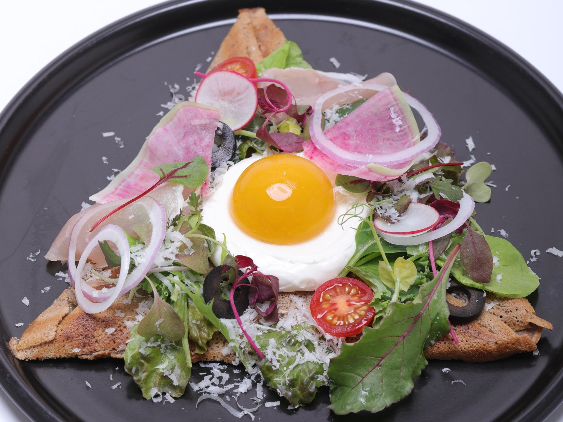 定番のハム、チーズの他にオニオンと旬のキノコをソテーし、ガレットで包みました。紅芯大根やラディッシュなどの秋野菜をたっぷり盛り付け、最後にパルミジャーノ・レッジャーノと、パウダー状にしたオリーブオイルをふりかけ、華やかなサラダに仕立てています。半熟目玉焼きはパンプキンソースとクリームチーズで表現しました。