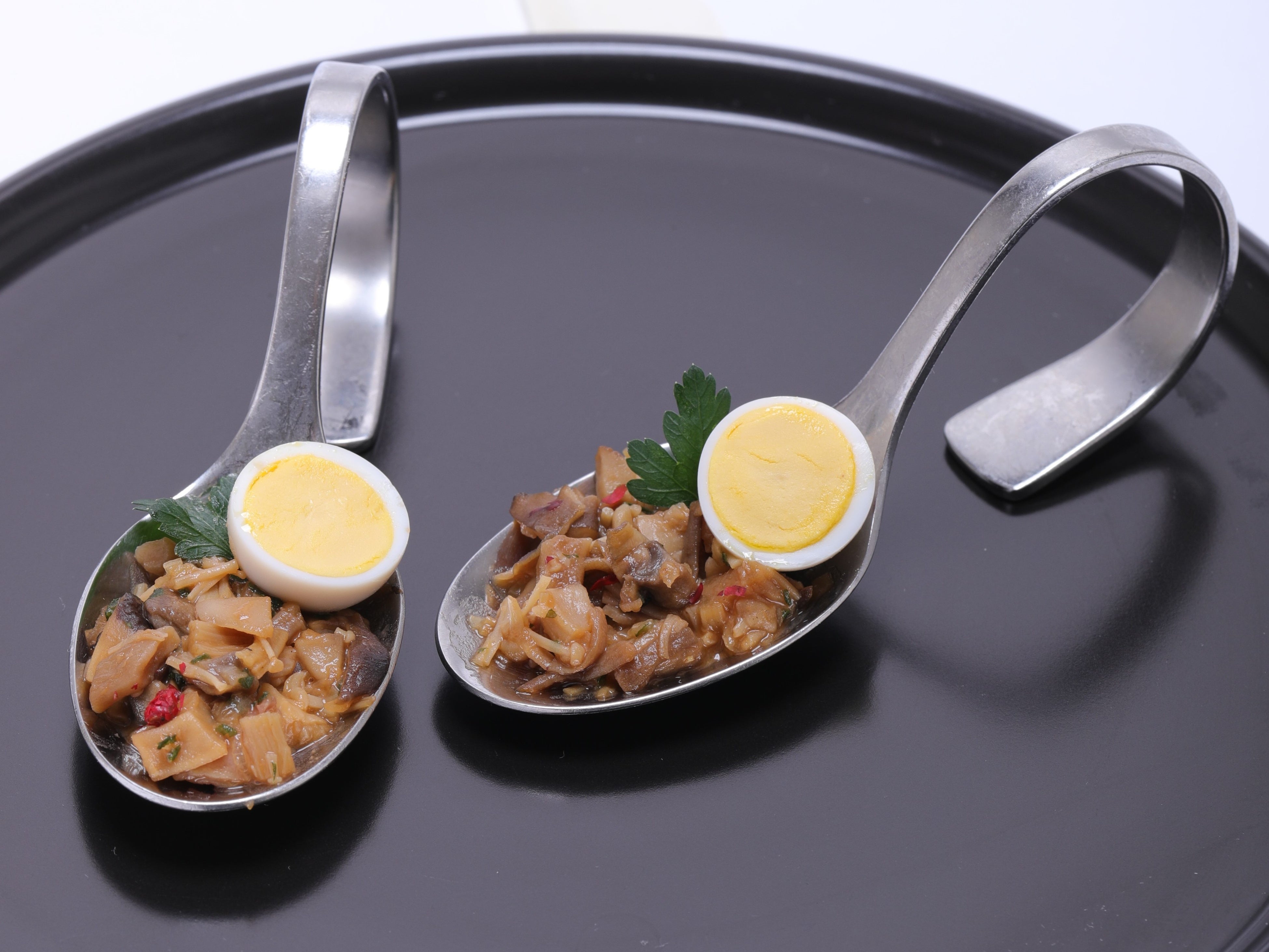 しいたけ、エリンギ、しめじ、エノキなどをフォンドヴォーでソテーしたフランスボルドー地方の料理。ぎゅっと詰まったキノコの旨味の中に、ピンクペッパーとイタリアンパセリが爽やかに香ります。