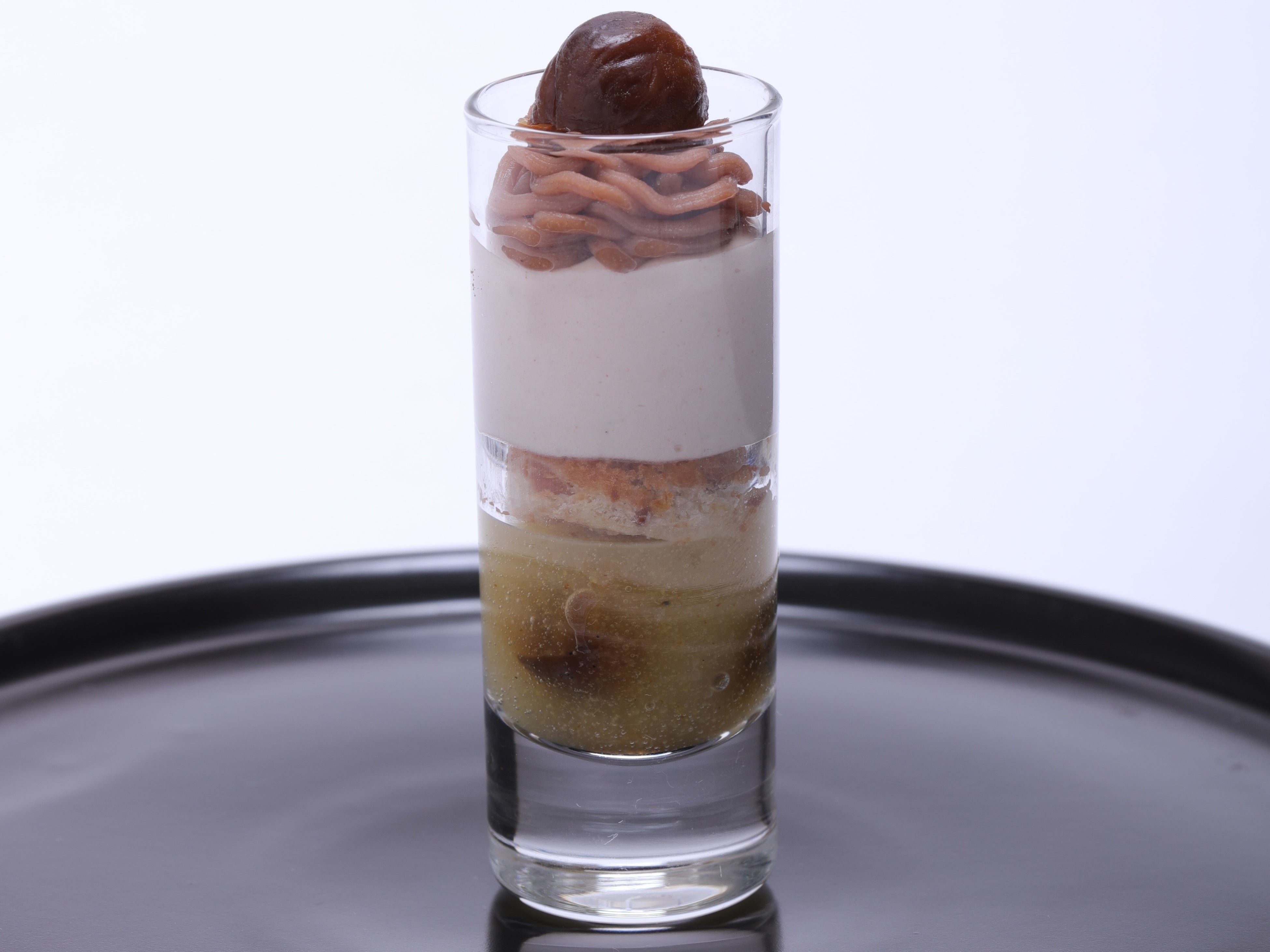 和素材の栗とフランスの洋梨を使用したグラスデザート。濃厚なマロンペーストに、なめらかなマロンクリームと洋梨の酸味がマッチします。