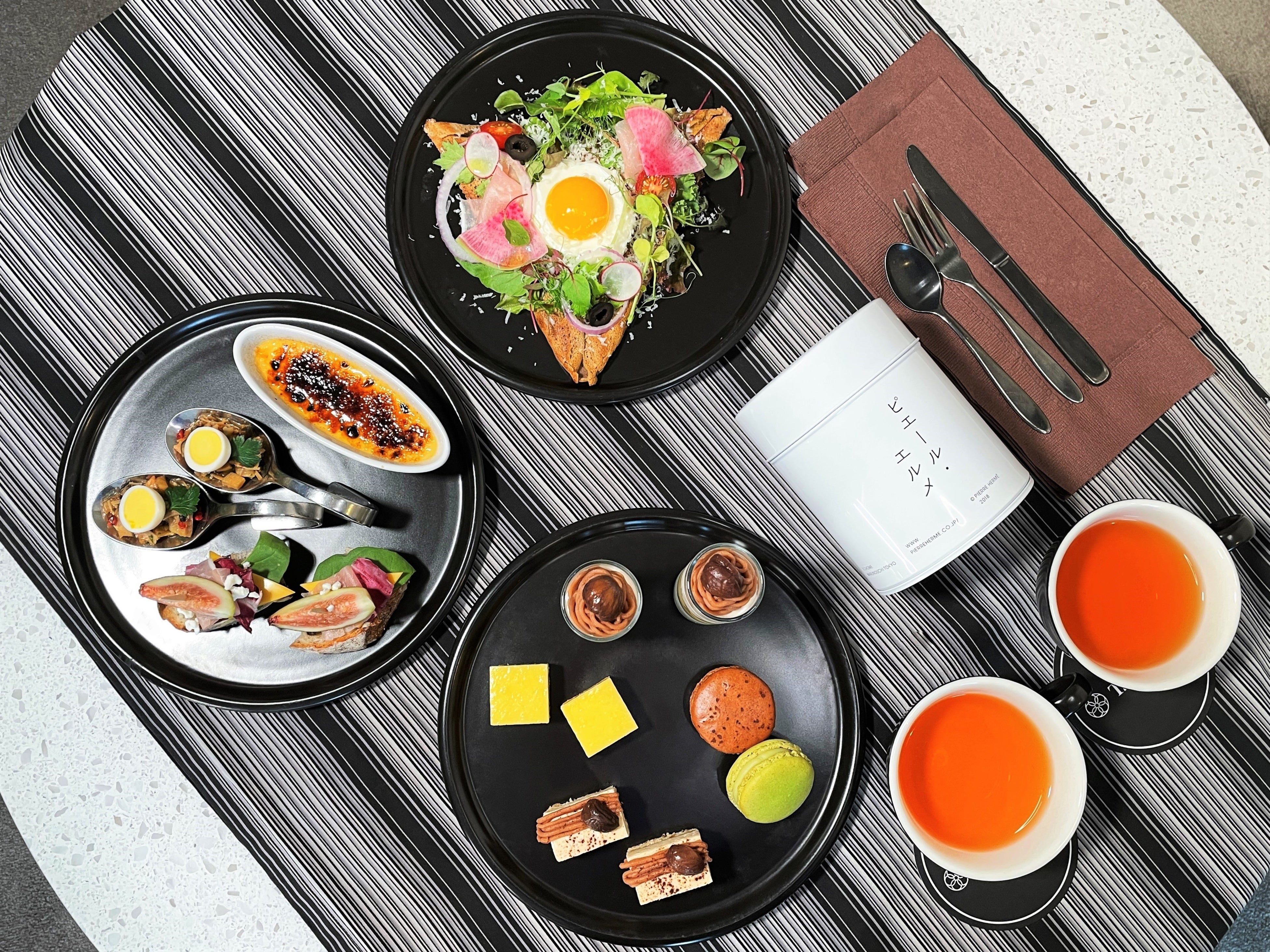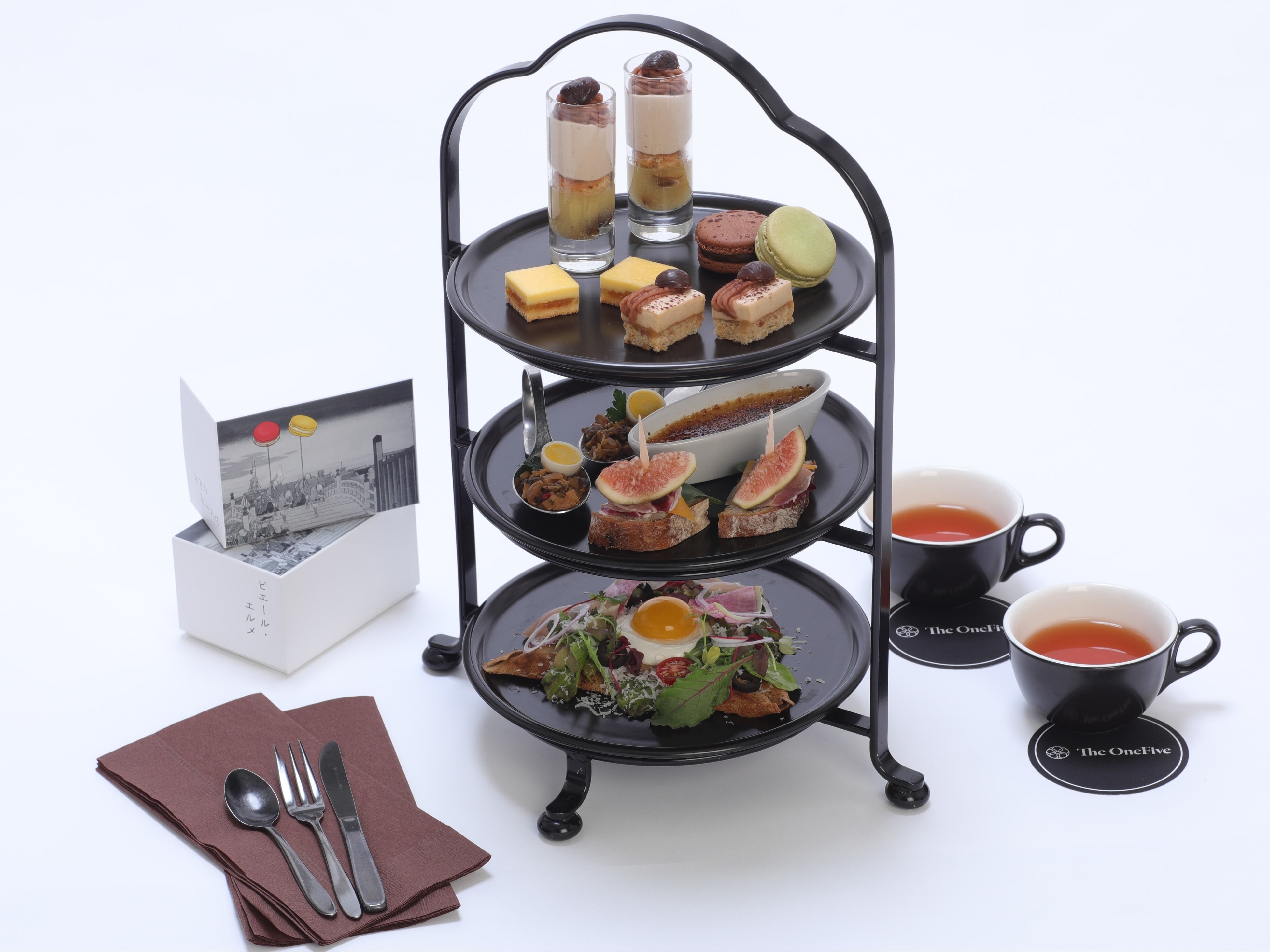 1段目は定番人気のマカロンや柚子を使用したチーズケーキなど、ピエール・エルメの秋を一皿に。2段目はフレッシュなイチジクや、旬の茄子をアレンジしたフレンチ仕立てのセイボリー。3段目はフランスの定番おやつ、ガレットにThe OneFive流の遊び心を加えました。