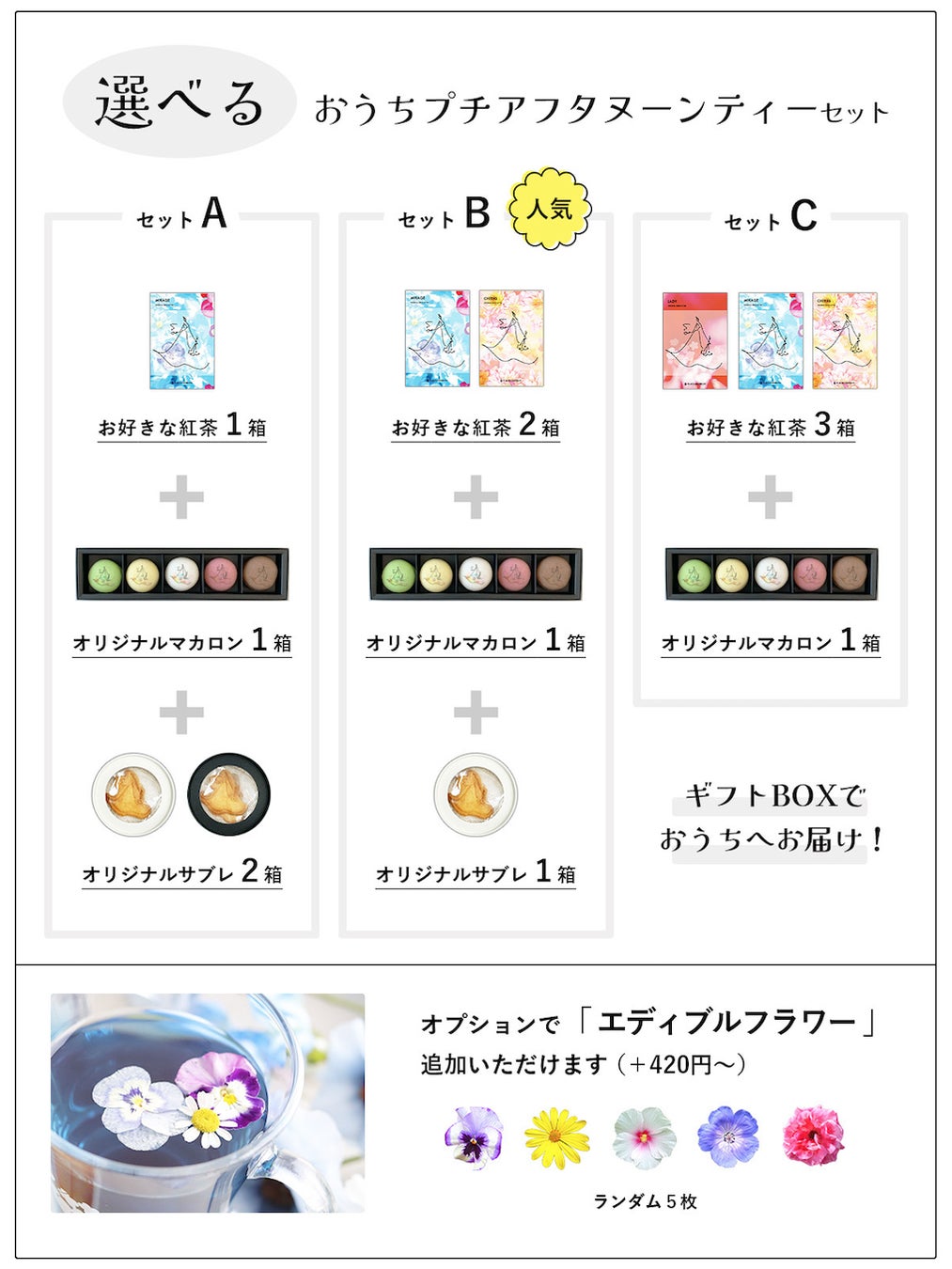 そして8月新商品「オリジナルサブレ」をピックアップした、特別なギフトセット。お好きなセット3種類(A・B・C)から自由に選んで、自分だけのオリジナルアフタヌーンティーをおうちでお楽しみいただける体験型ギフトです。