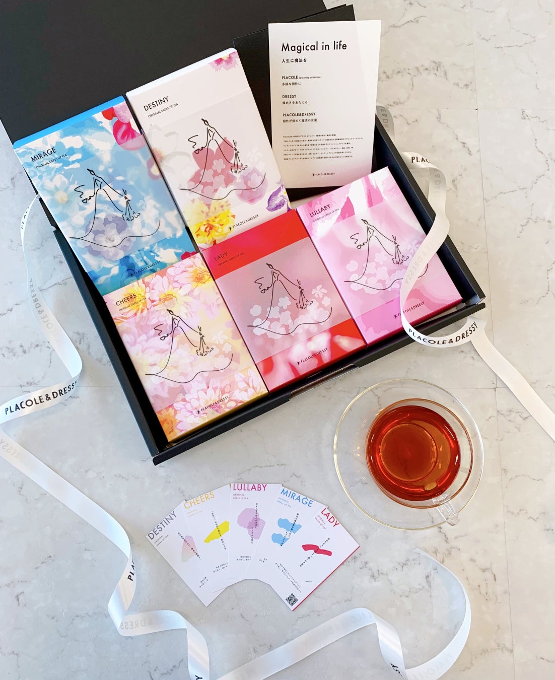PLACOLE&DRESSYが提供する、人生に魔法をかける「オリジナルティー」から個性あふれる5種をセットでお届け。美容・健康成分を含む高級茶葉を使用し、国内有数の生産者と共同開発を進めた