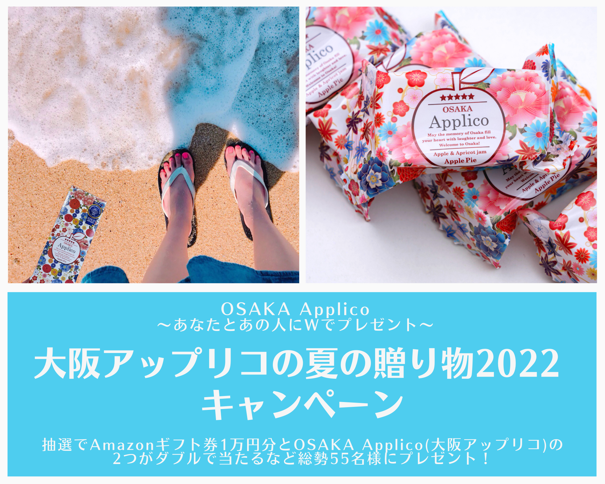 条件を満たし応募頂いた方の中から抽選で「Amazonギフト券1万円分+ OSAKA Applico(大阪アップリコ)10個入り1箱、5個入り1箱(その2つについて、それぞれを2カ所に分けて送付可能)」を5名様に、「Amazonギフト券1,000円分+アップリコ10個入り1箱(1カ所に送付可能)」を20名様など、総勢55名様にプレゼントをお送りさせて頂きます。