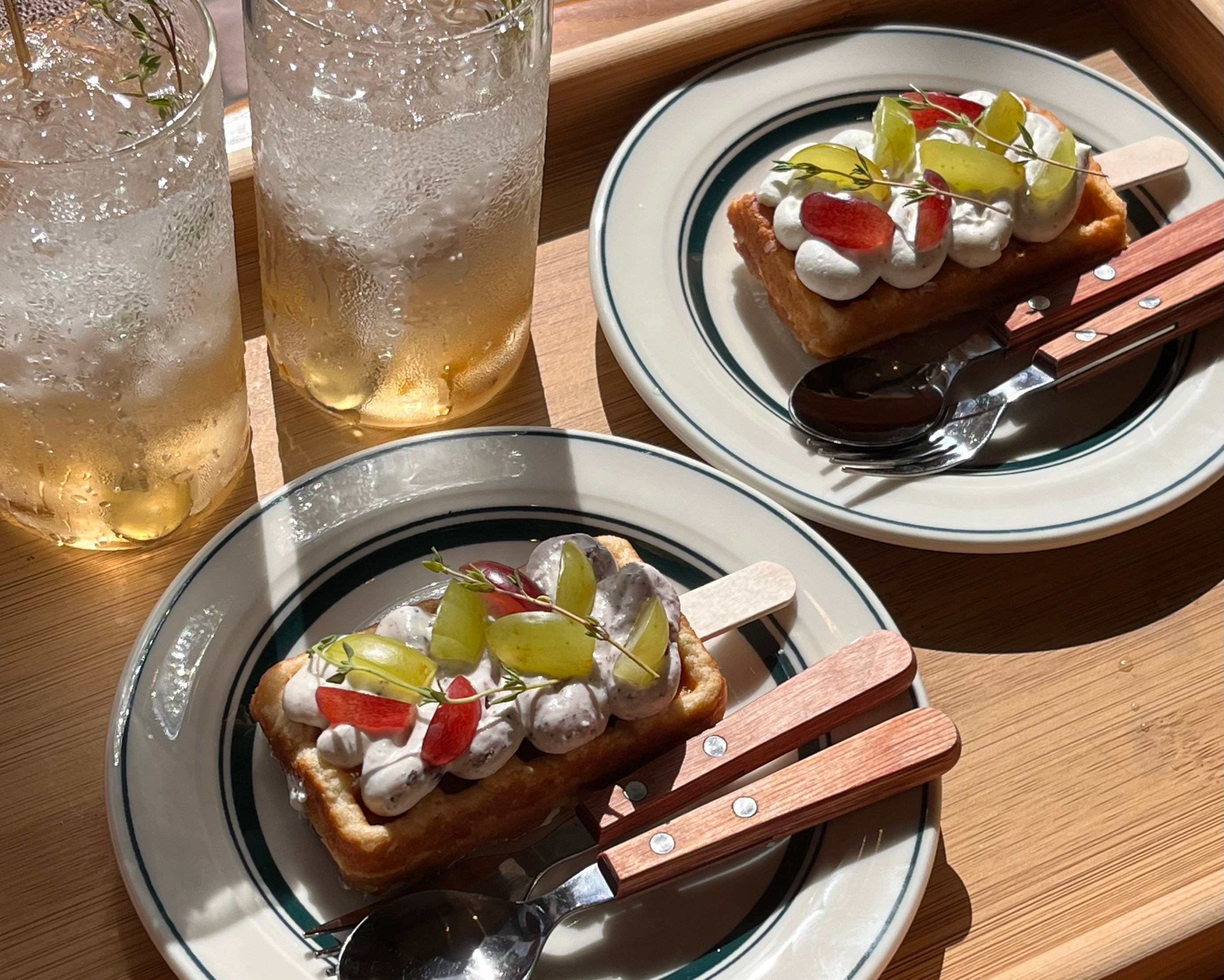 ひんやりと冷やしたワッフルは、いつも以上にしっとりとした食感に。爽やかな甘さのバタークリーム・色鮮やかでフルーティーなシードレスグレープ。どちらもさっぱりとした味わいで、暑い夏でも楽しんでいただける一皿です。
