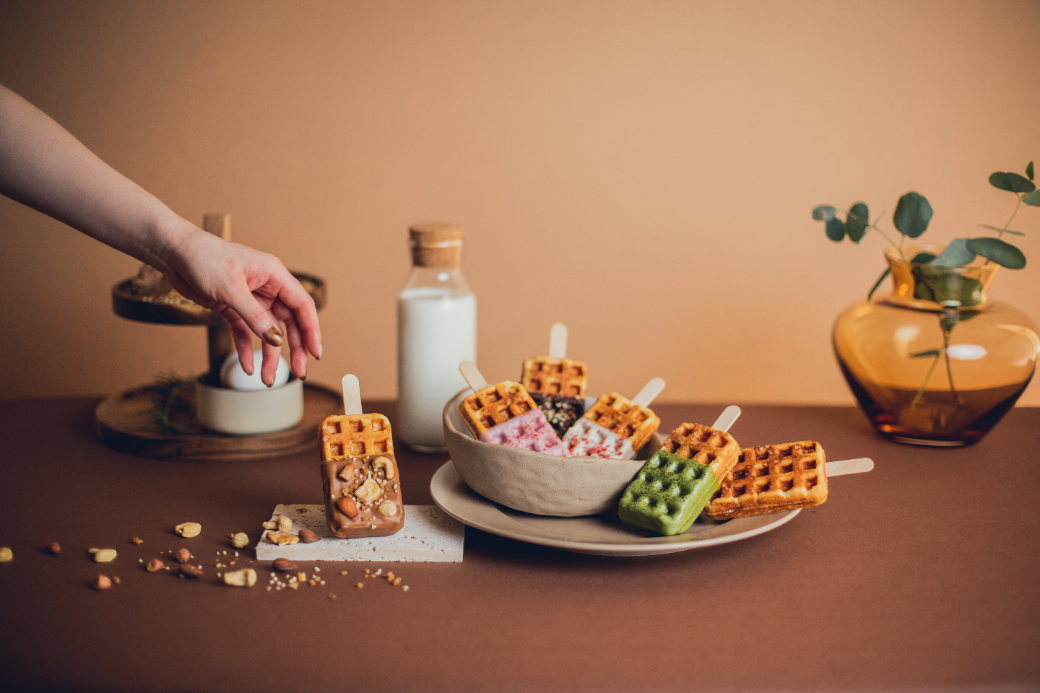 また、ビジュアルだけでなく、最後の一口まで楽しめるような食感にもこだわり、「京ワッフル」の生地には大きなザラメを練り込んでお作りしています。