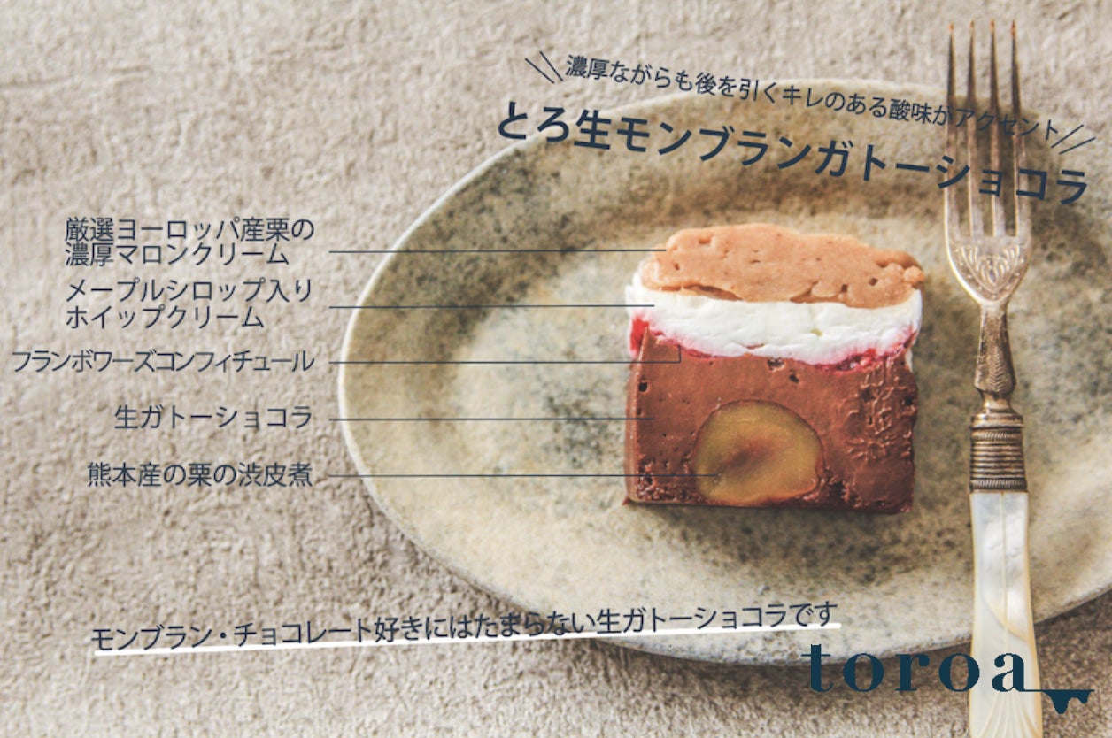 株式会社フードクリエイティブファクトリー(本社:東京、代表取締役社長:五十嵐豪、以下FCF)が運営する極上スイーツブランド「toroa(トロア)」より、秋の新作「ほうじ茶マロンとろ生ガトーショコラ」と、昨年大人気の「とろ生モンブランガトーショコラ」を発売することが決定いたしました。