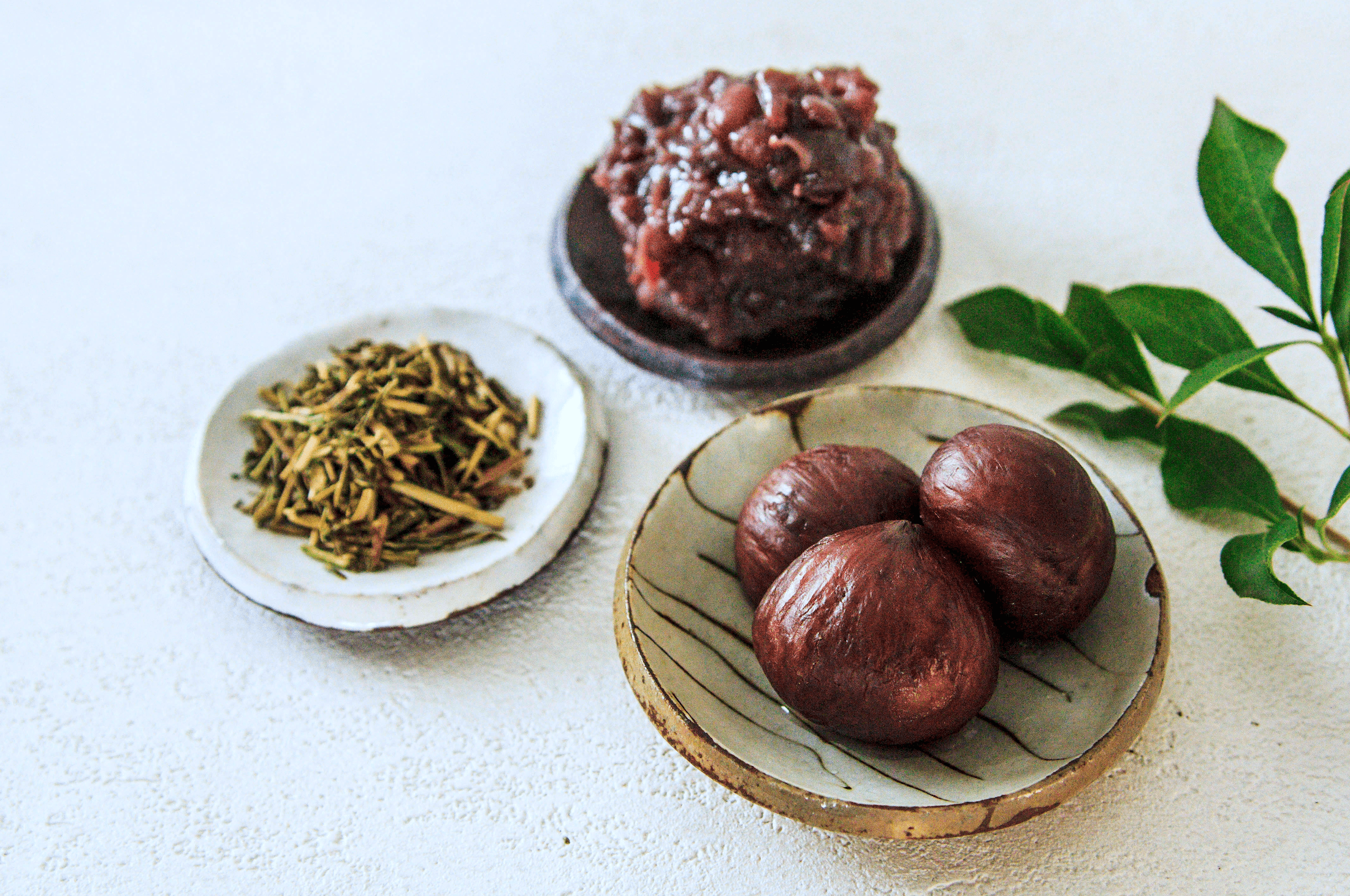 3.ほうじ茶と相性のいい、栗の渋皮煮や北海道産小豆使用の粒あんをふんだんに使用