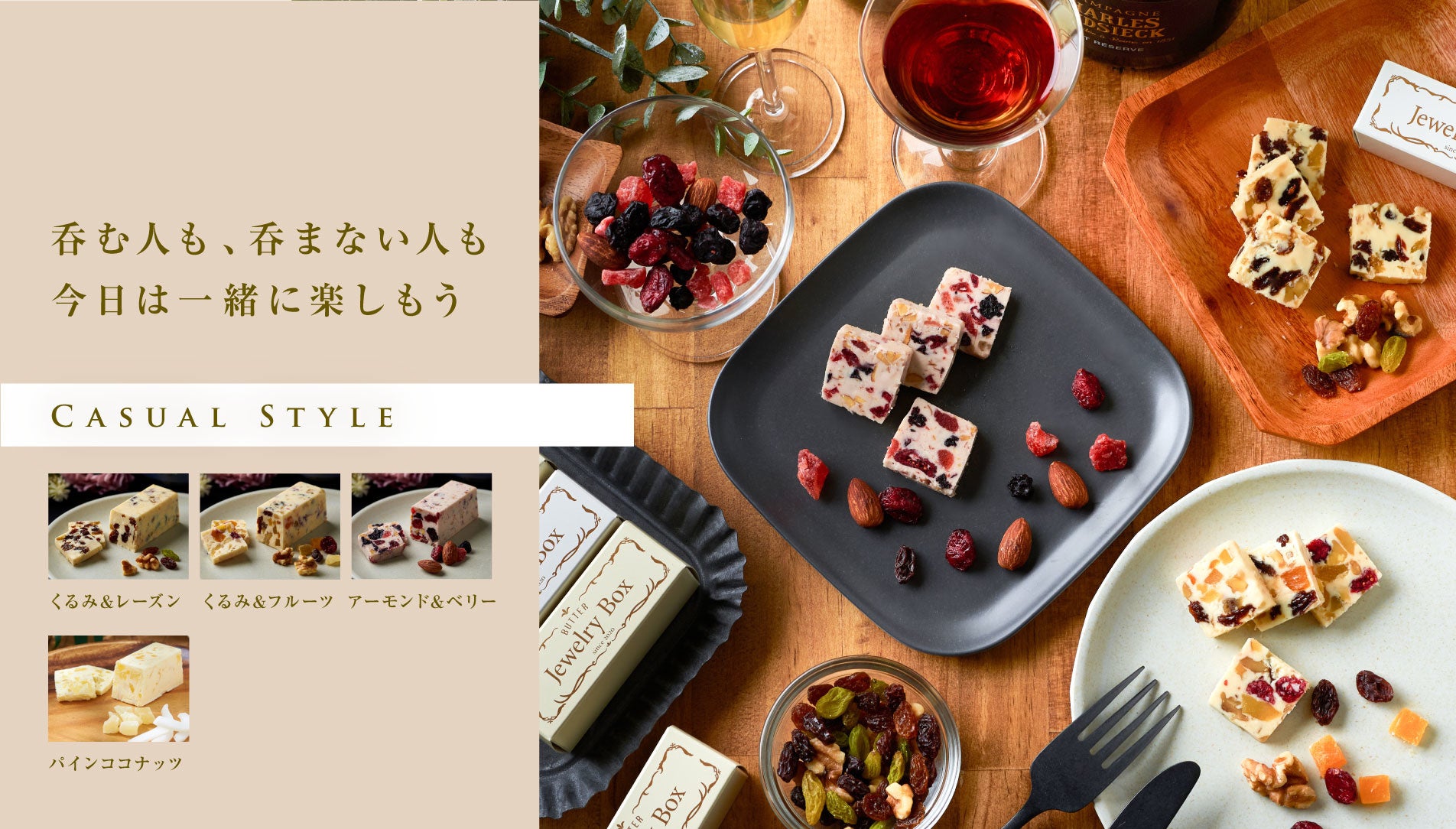 オープンから1年、レーズンバター専門店Jewelry Boxが一部商品をリニューアル。「呑む人も、呑まない人も、今日は一緒に楽しもう」をコンセプトに、ナッツの食感が新鮮な『Casual Styleシリーズ』を8月11日(木)より発売。クリームチーズをブレンドしたバターベース・厳選したドライフルーツ・カリッと香ばしいナッツの風味を心地良く調和させた『進化系フレーバーバター』をご賞味ください。