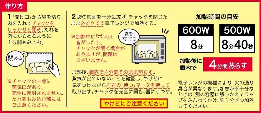 コク深く仕上げた本格ソースは、厳選した素材で調味し、旨みを引き出しました。レンジ専⽤パウチでの加熱による「スチーム効果」と蒸らしで、お肉がふっくらと仕上がります。おうちにいながら、一流レストランで食べるような本格的な一品を、簡単に作ることができます。