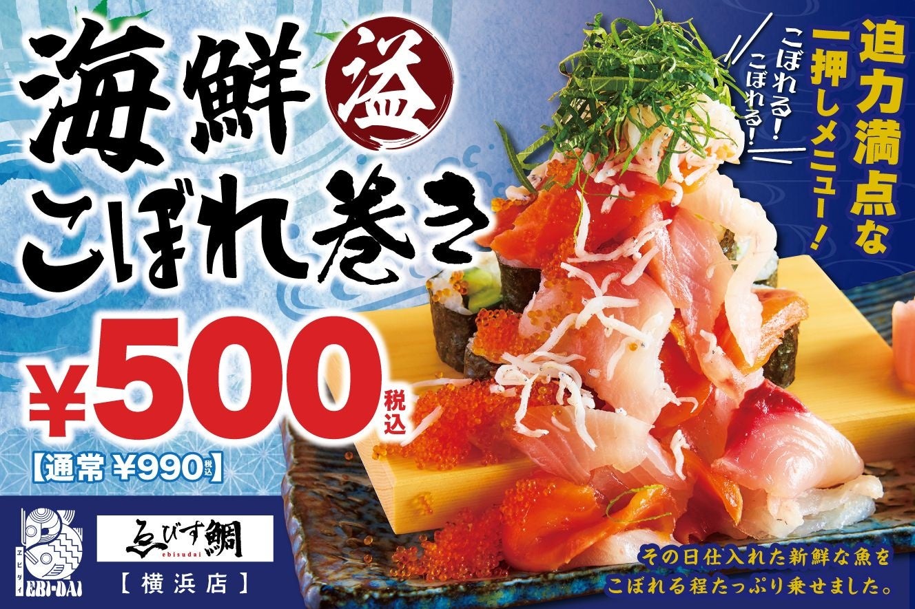 毎朝仕入れる鯛をはじめとした海鮮料理が自慢の店「ゑびす鯛 横浜店」(運営:株式会社TBI JAPAN、本社:東京都新宿区、代表取締役社長 後藤 浩之)は、8月15日の”刺身の日”を記念して、迫力満点な名物メニュー【海鮮こぼれ巻き】を通常980円のところ、ワインコインの500円で提供するキャンペーンを、2022年8月8日(月)~21日(日)の期間限定で実施いたします。
