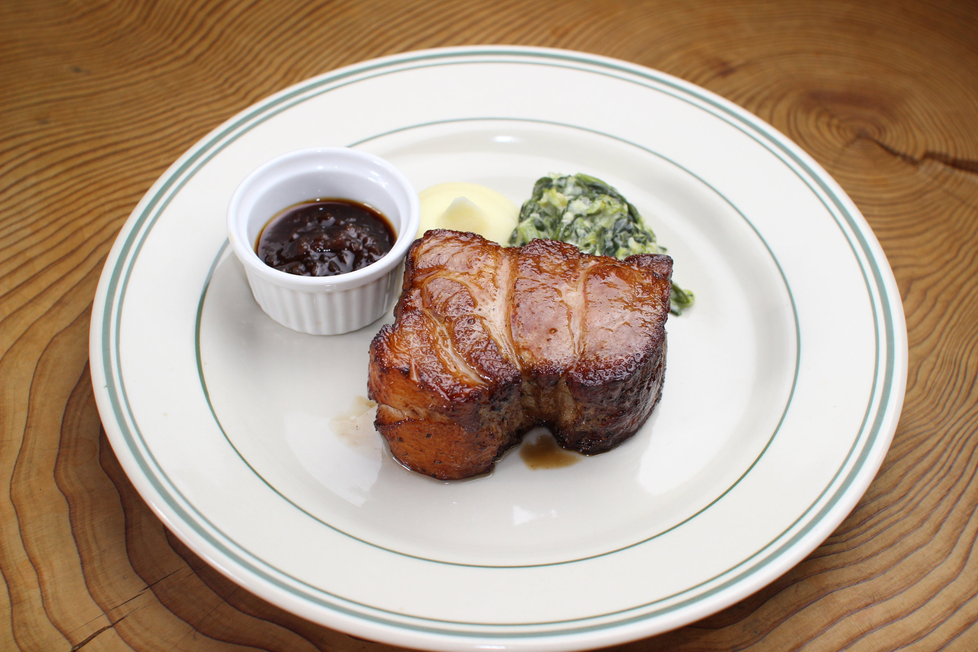 真空低温調理でじっくりと火を通した豚肉を、仕上げにオーブンでクリスピー状に焼き上げます。分厚いポークステーキは、表面の香ばしさが食欲を刺激し、ナイフを入れるとしっかりした肉質ながらもあまりのやわらかさに感動を覚えると思います。