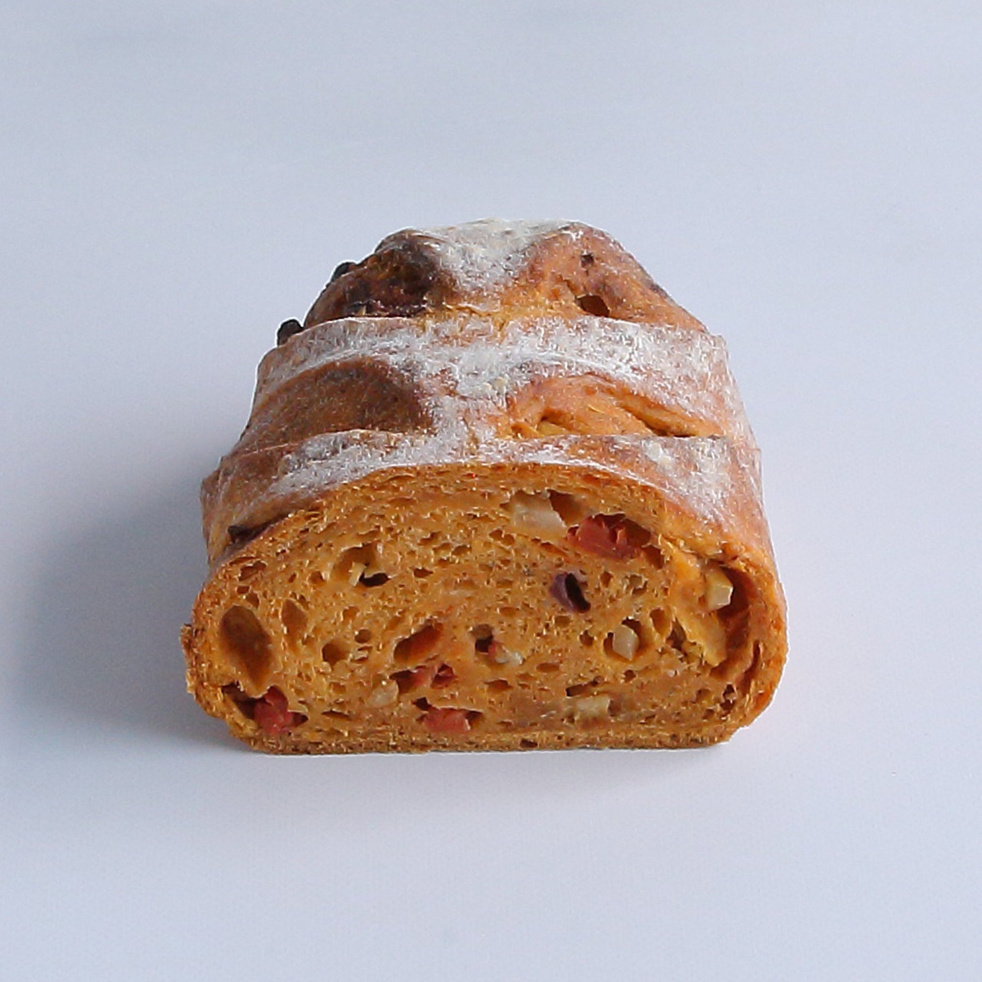 白ワインで漬けたシャインマスカットと赤ワインで漬けたプルーンを入れて。香りの良いフルーティーなパネトーネです。