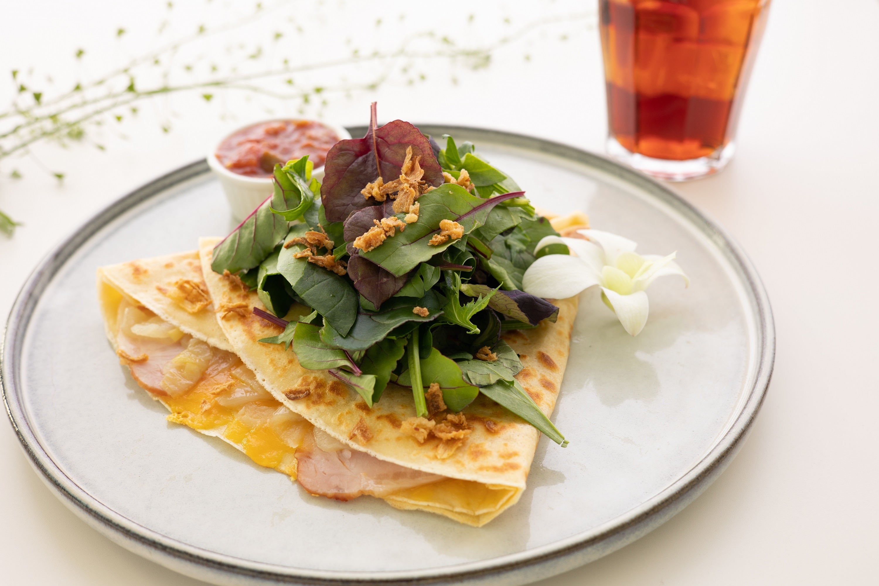 ※チェダー、ほうれん草、ベビーリーフ、 ソテーオニオン ハム、サルサソース添え