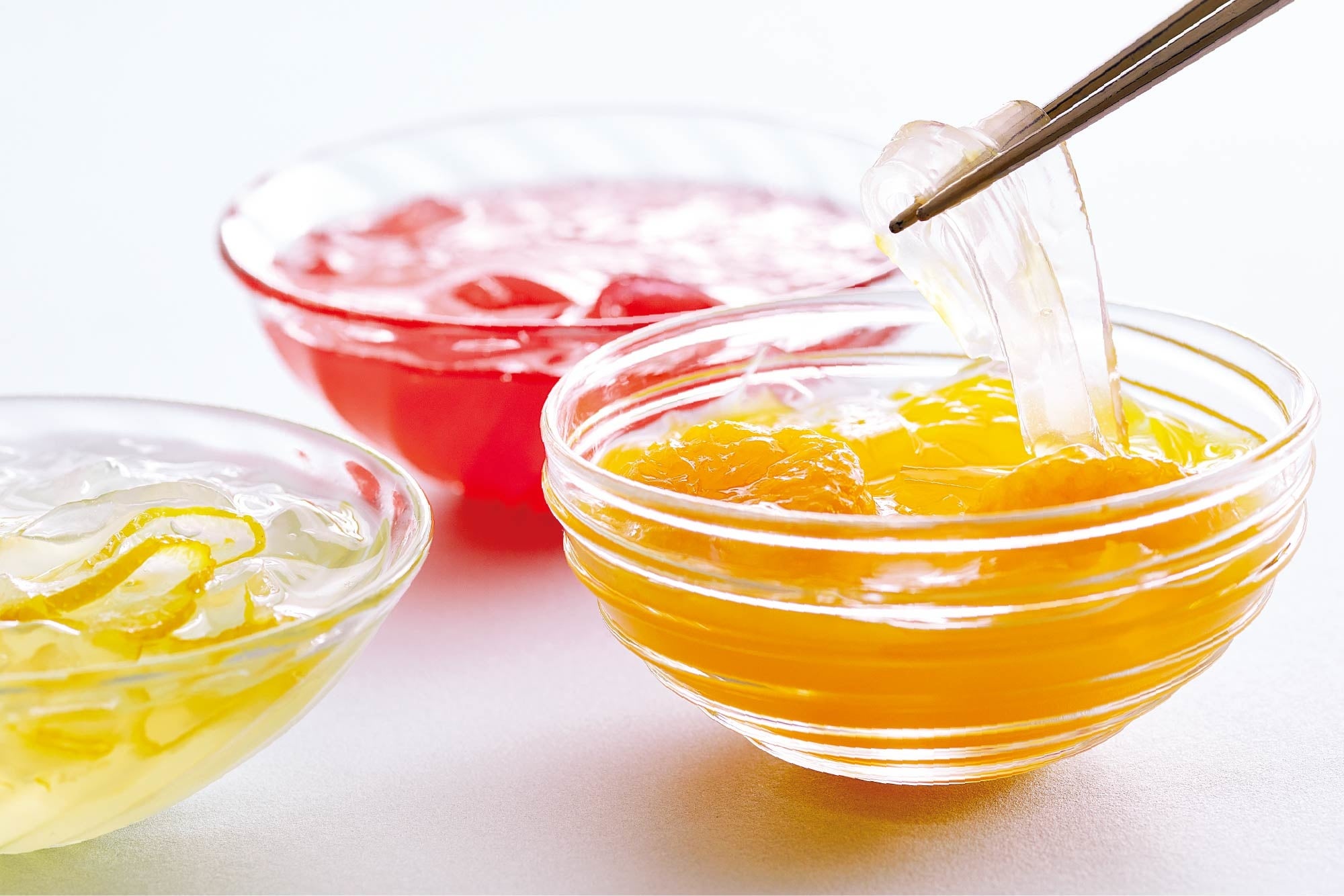 夏の和菓子といえば、透明感とつるりとした喉越しが人気の葛(くず)切り。この葛切りを、「温州みかん」「柚子」「赤しそ」3種のジュレとあわせたみずみずしい和菓子です。